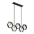 The 5Lt Pendant Bismarck, has a geometric frame finished in Earth Black, which emphasizes the bold lines of its modern design. Painted gold sockets serve as the perfect contrast in both tone and style, adding drama and depth.