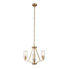 The Deryn 3-light chandelier, delivers a minimalist style with crisp, clean lines and an inverted diamond shape structure. Accented with clear seeded glass and a Natural Brass finish - making it the perfect addition to modern or transitional settings.