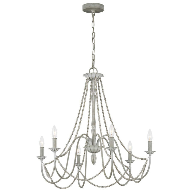 The 6lt Maryville chandelier has soft feminine features in a French Country style. The floral inspired bobeches and delicate wood bead strands are all finished in a Weathered Washed Grey.