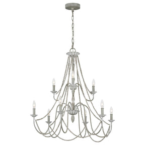 The 9lt Maryville chandelier has soft feminine features in a French Country style. The floral inspired bobeches and delicate wood bead strands are all finished in a Weathered Washed Grey.