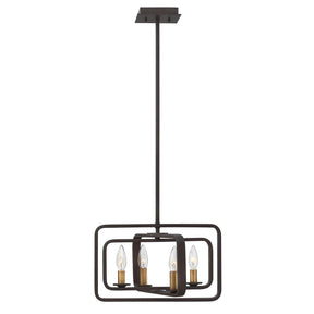 Quentin is constructed of angular forms that create a striking geometric interplay. This stem-hung collection features intersecting rectangles in a bold Buckeye Bronze finish, forming a modern silhouette. Candle sleeves in Heritage Brass add a distinctively vintage feel.