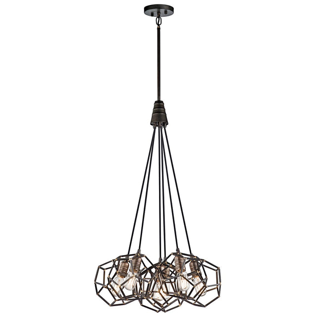The Vintage Industrial style of the Rocklyn collection is clear with its Raw Steel finish and geometric wire frame structure. The cluster design is highlighted with Natural Brass accents.