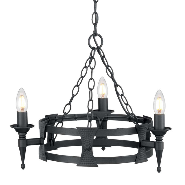 The wrought iron Saxon range is designed and manufactured by Elstead Lighting. Using a mixture of traditional and modern manufacturing methods, this medieval style family has decorative beaten metal panels to separate the candle-holders. Finished in Black.