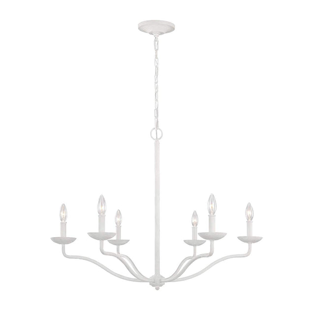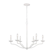 The Annie 6 arm chandelier is constructed of steel but finished in a heavy textured plaster white. This simple and elegant design draws on the popular coastal themed genre.