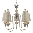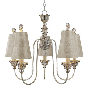 The Remi chandelier has a hand-crafted appearance, with silver sculpted elements including fleur-de-lis inspired bobeches, highlighted with brushstrokes of red paint. This 5 light chandelier is completed with grey and cream crackle painted shades for a truly unique look.