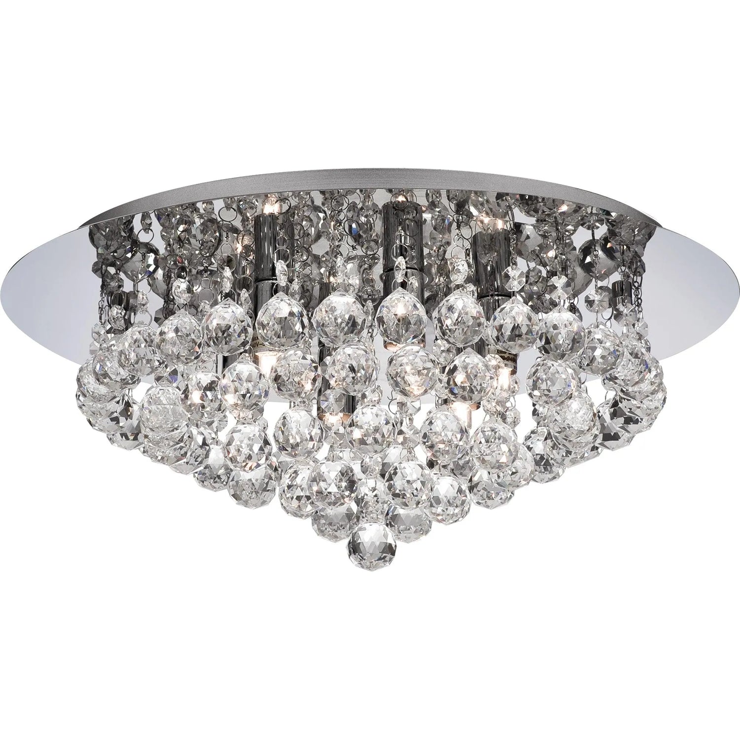 This Hanna chrome 6 light ceiling fitting with clear crystal balls looks imposing on any ceiling. The luxurious light fits flush to the ceiling and features six lamps surrounded by decadent crystal trimmings and balls. And the elegant mirrored backplate completes the look of this modern chandelier.