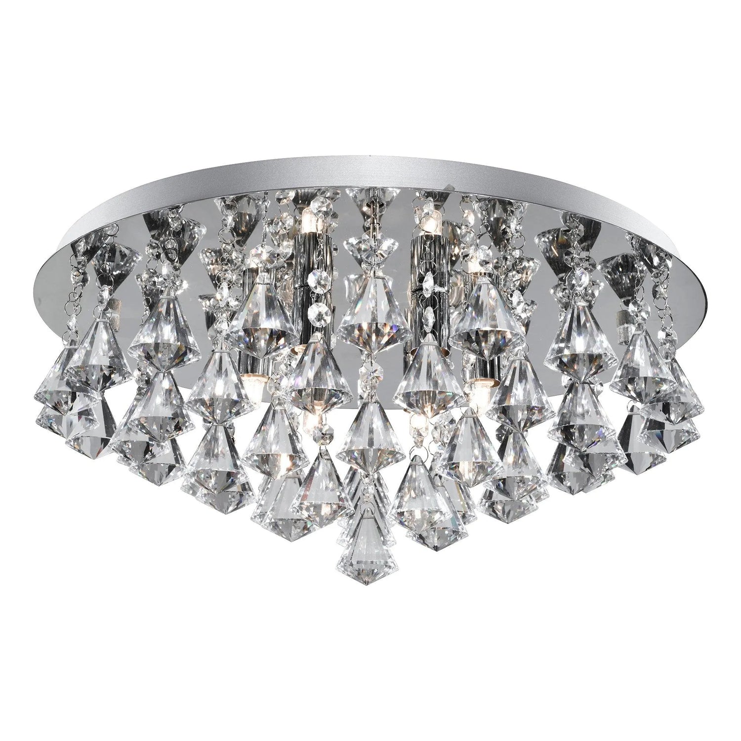 This Hanna chrome 8 light flush ceiling fitting with diamond shape crystals looks magnificent on any ceiling. The luxurious light fits flush to the ceiling and features eight lamps surrounded by clear crystal trimmings, with diamond shaped droplets. And the elegant mirrored backplate completes the look of this large, contemporary chandelier.