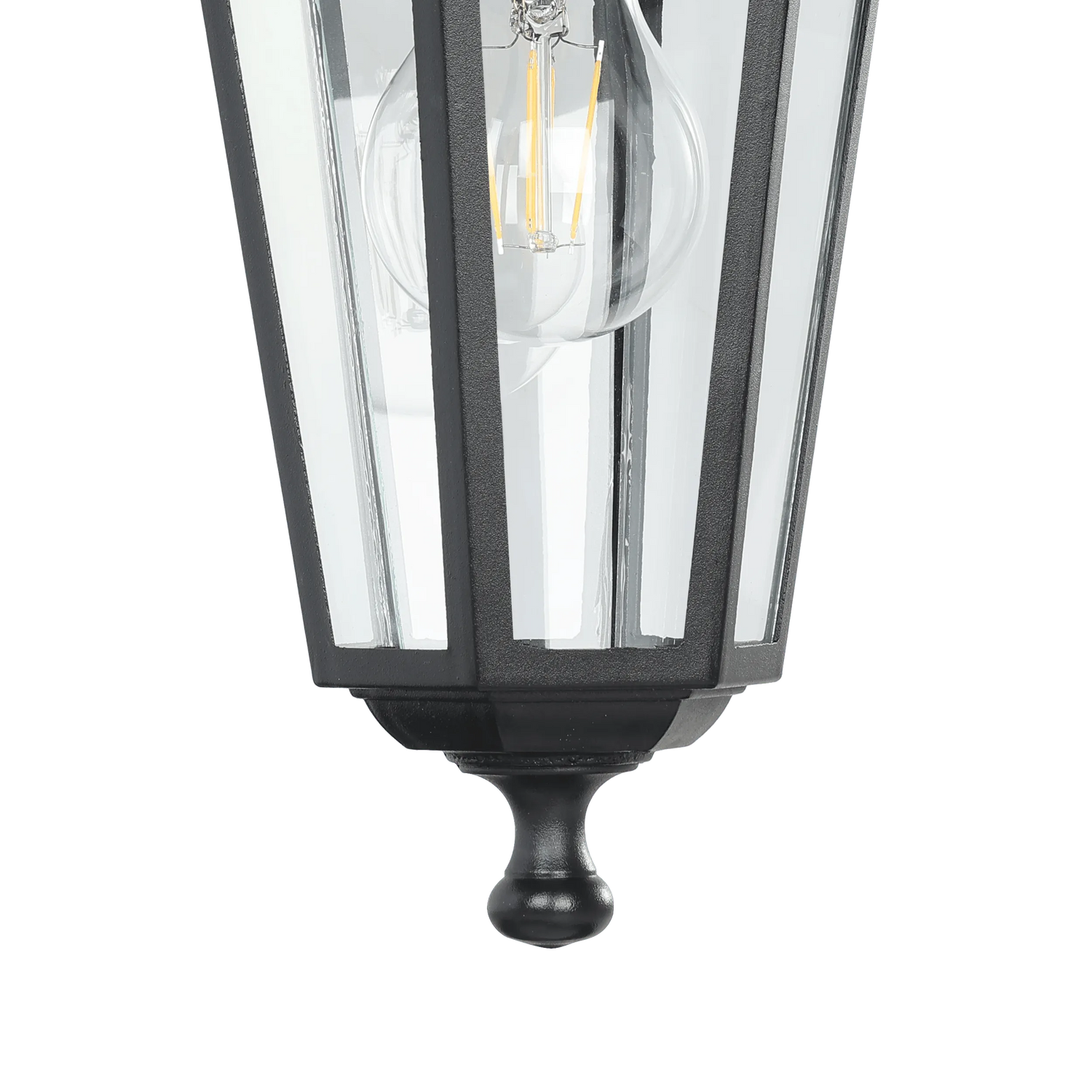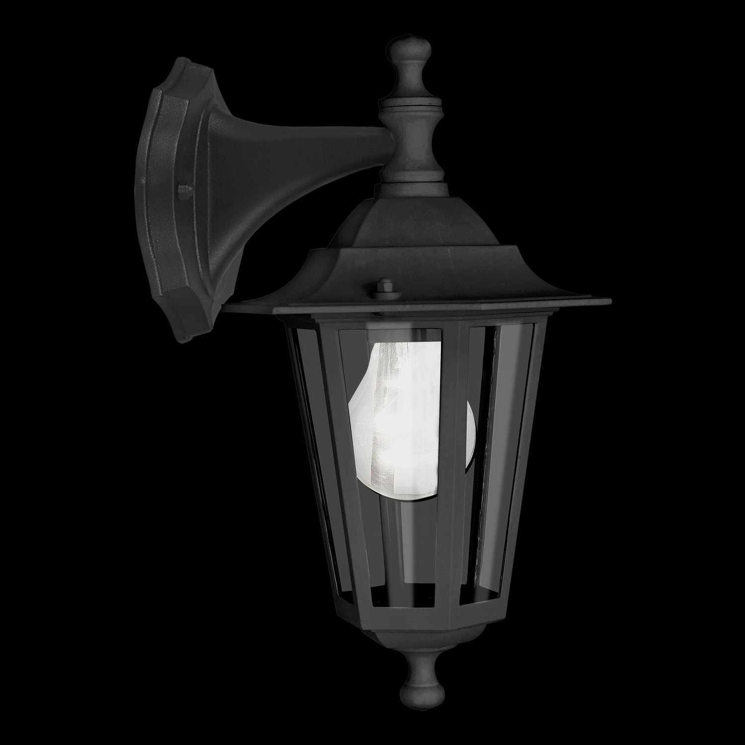 The (hanging) lantern-style LATERNA 4 exterior wall light has a black cast aluminium body with clear glass panes. The product is suitable for outdoor use due to its IP44 protection against spray water and, with its classic design, blends into outdoor spaces in a wide range of styles. This exterior wall light provides lighting that suits settings such as traditional-style or art nouveau city villas – the perfect wall light for house entrances, terraces or the balcony. The pictured lightbulb is not included. The product has an E27 lamp holder and requires an E27 lightbulb.