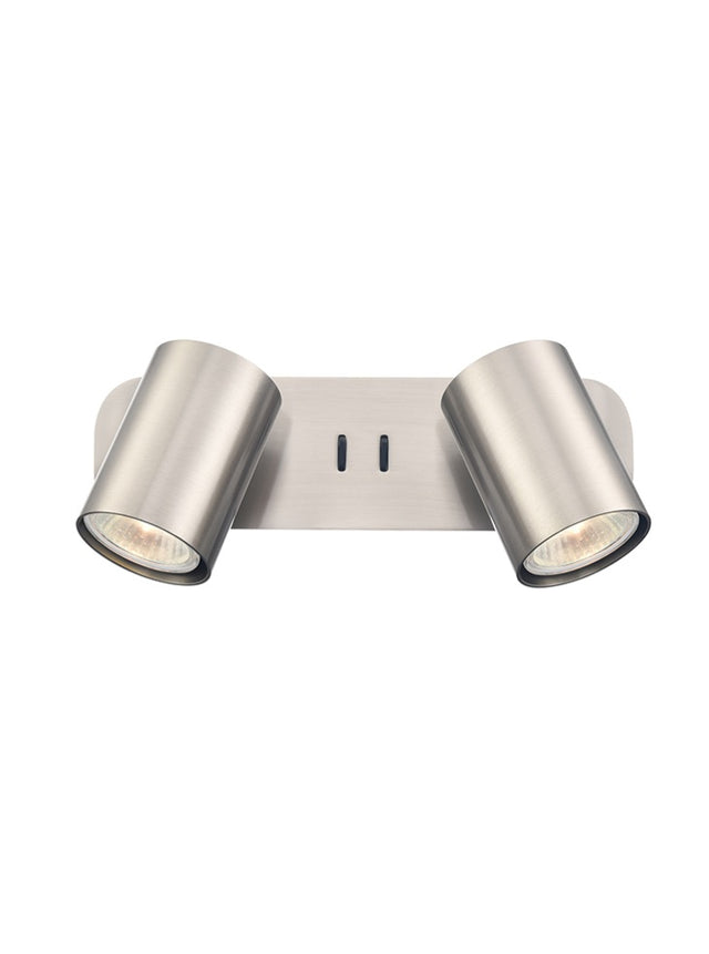 Satin nickel finish double adjustable wall light with switches on the backplate.