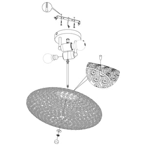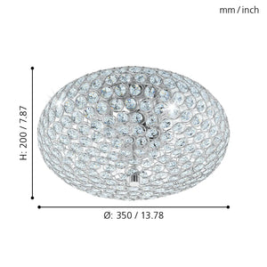 The CLEMENTE ceiling light is made from chrome-coloured metal with an oval lampshade made from rows of clear crystals. The high-end crystal elements create a sparkling, high-quality look as soon as the lamp is on. The ceiling light has a diameter of 35 cm and blends elegantly into modern interiors, creating the right mood in any space, whether in the living room, bedroom or hallway. Lightbulbs are not included. The product has E27 lamp holders and requires 2 x E27 lightbulbs.