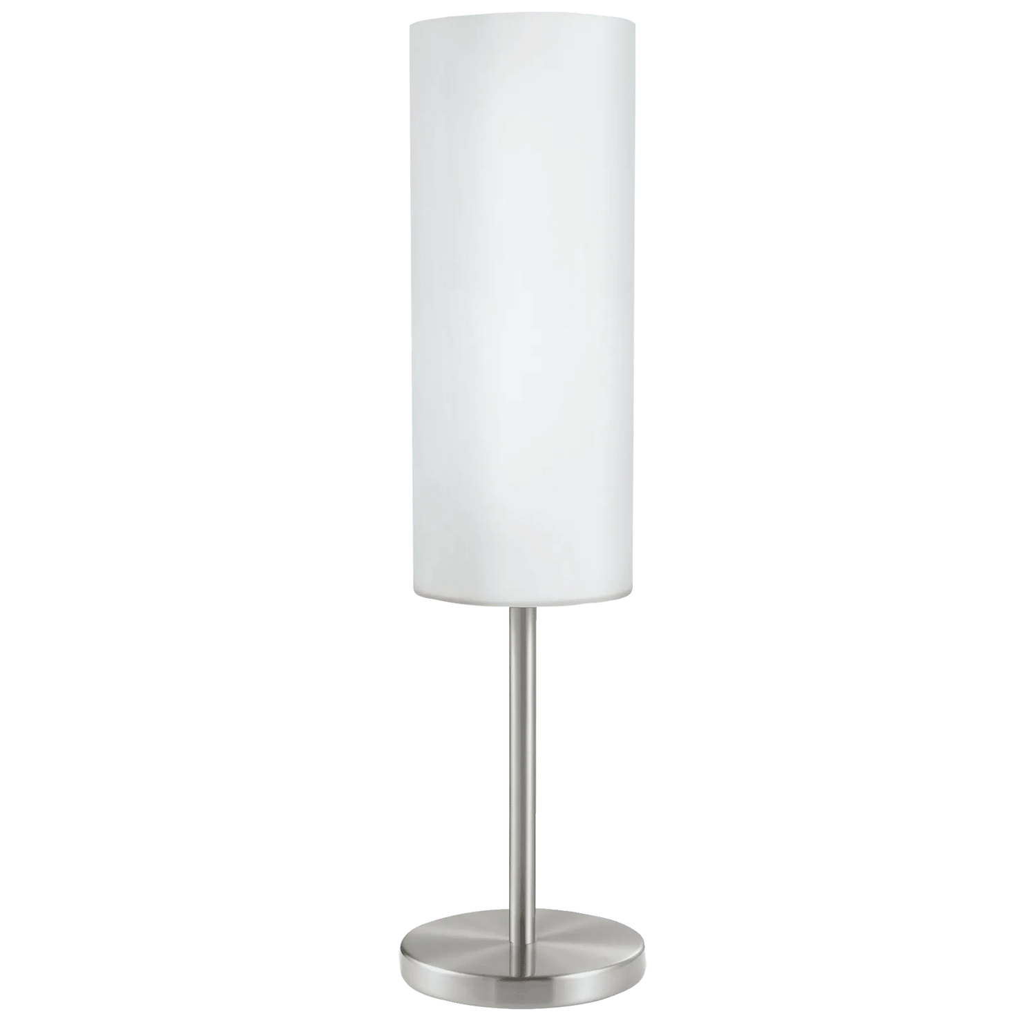 The TROY 3 table lamp features a metal base in a matte nickel finish and a cylindrical lampshade made of white satin glass. The table lamp switches on and off easily using the in-line switch. With its simple design, the table lamp works well with almost any interior style and creates cosy lighting in any space, whether in the living room, bedroom, hallway or dining room. The lightbulb is not included. The product has an E27 lamp holder and requires an E27 lightbulb.