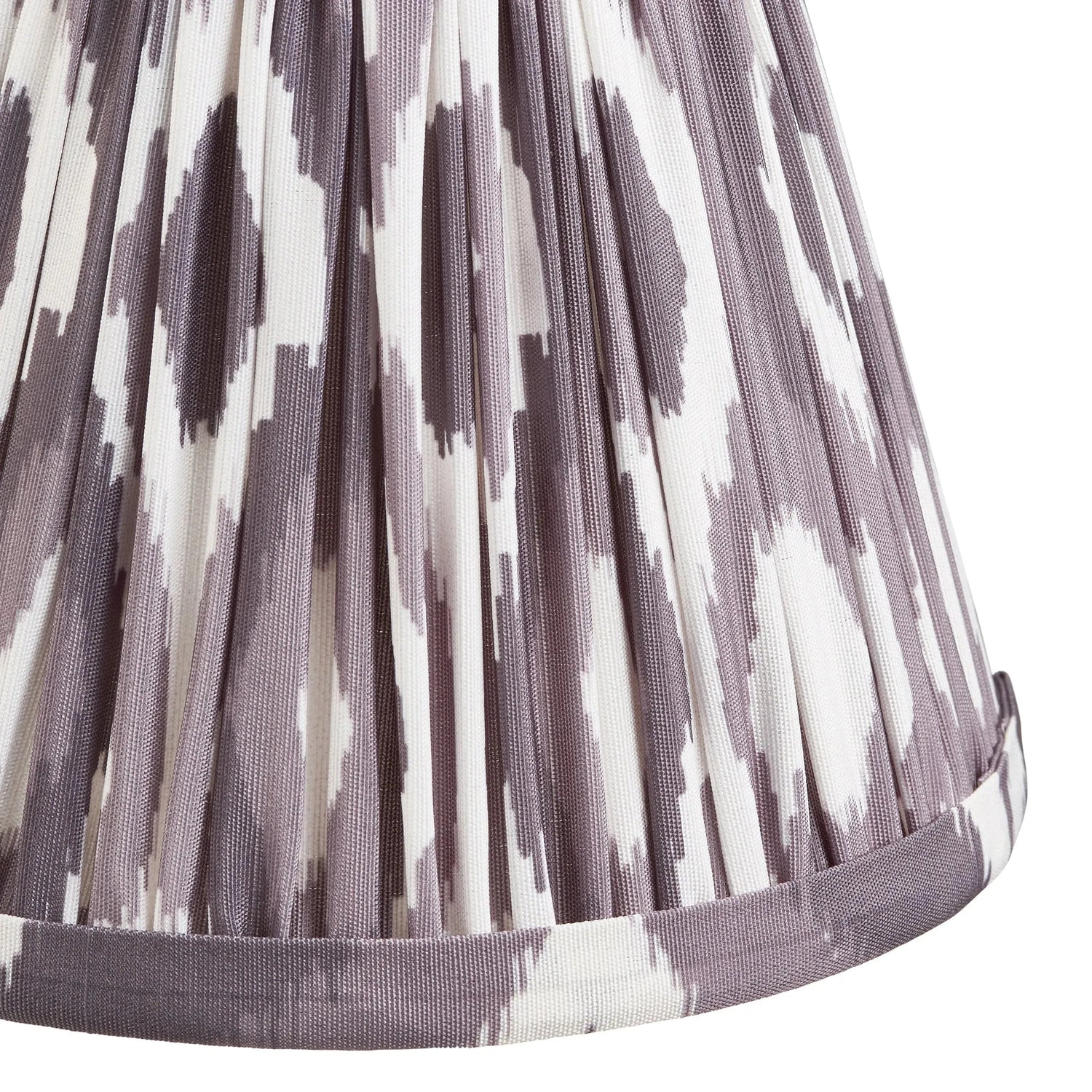 16cm tapered shade with clip gimbal to fit golf or candle bulbs. Unique Ikat pattern design in pearl grey with taped edge detailing and plain inner lining.