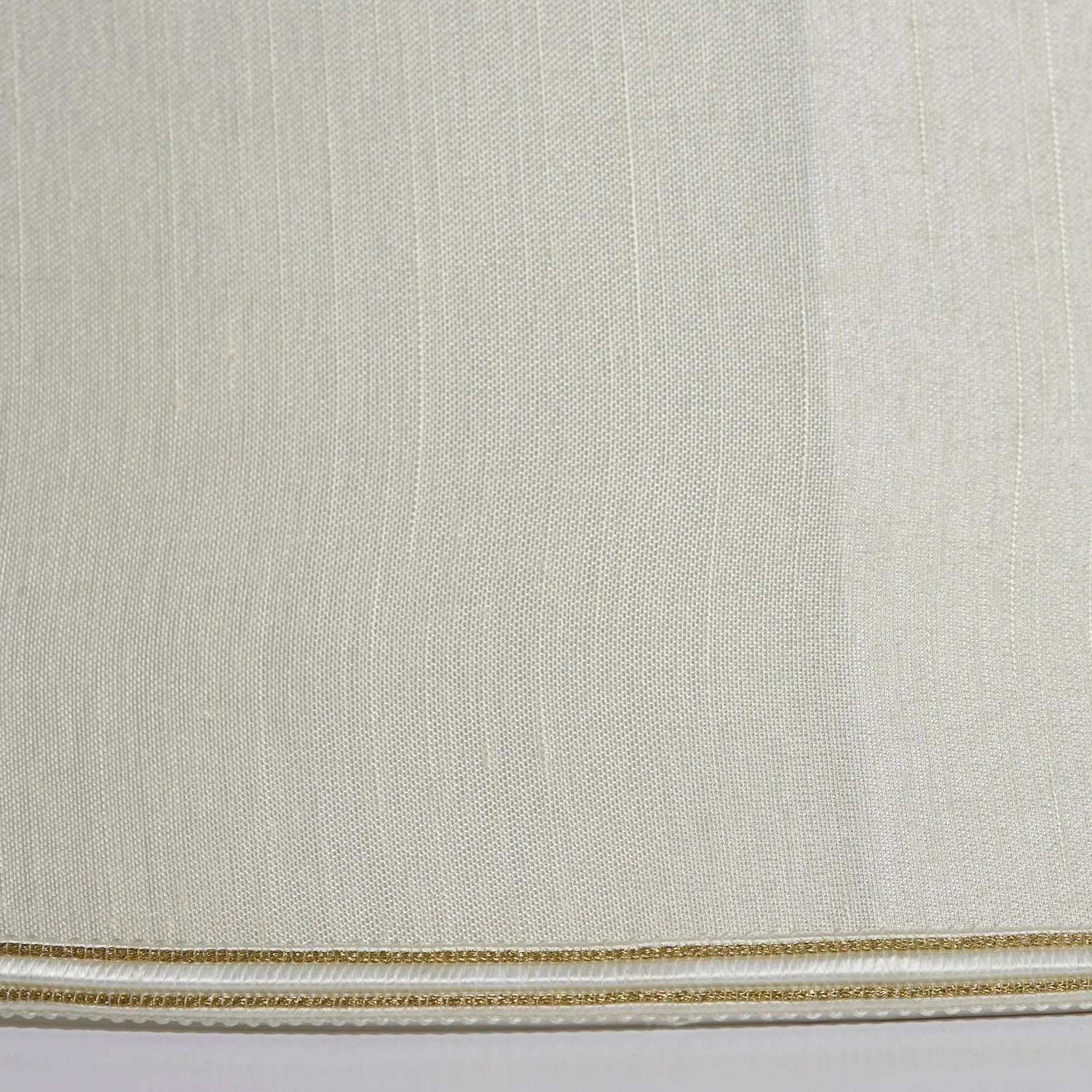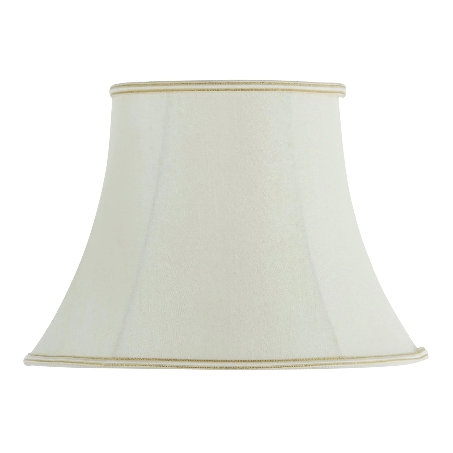 The 12 inch Celia handmade lamp shade is a balloon lined bowed oval in a cream fabric with a subtle woven trim on the top and bottom edges. Available in a choice of sizes