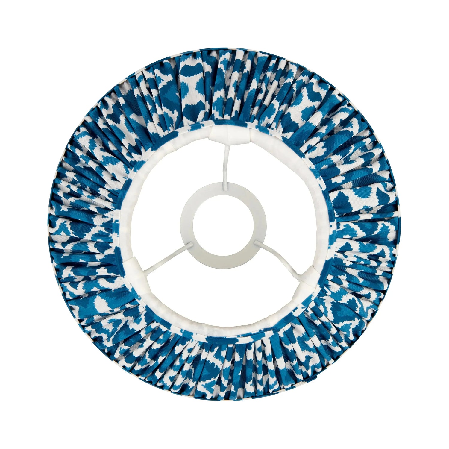 25cm tapered shade with white gimbal. Unique Ikat pattern design in marlin blue with taped edge detailing and plain inner lining.