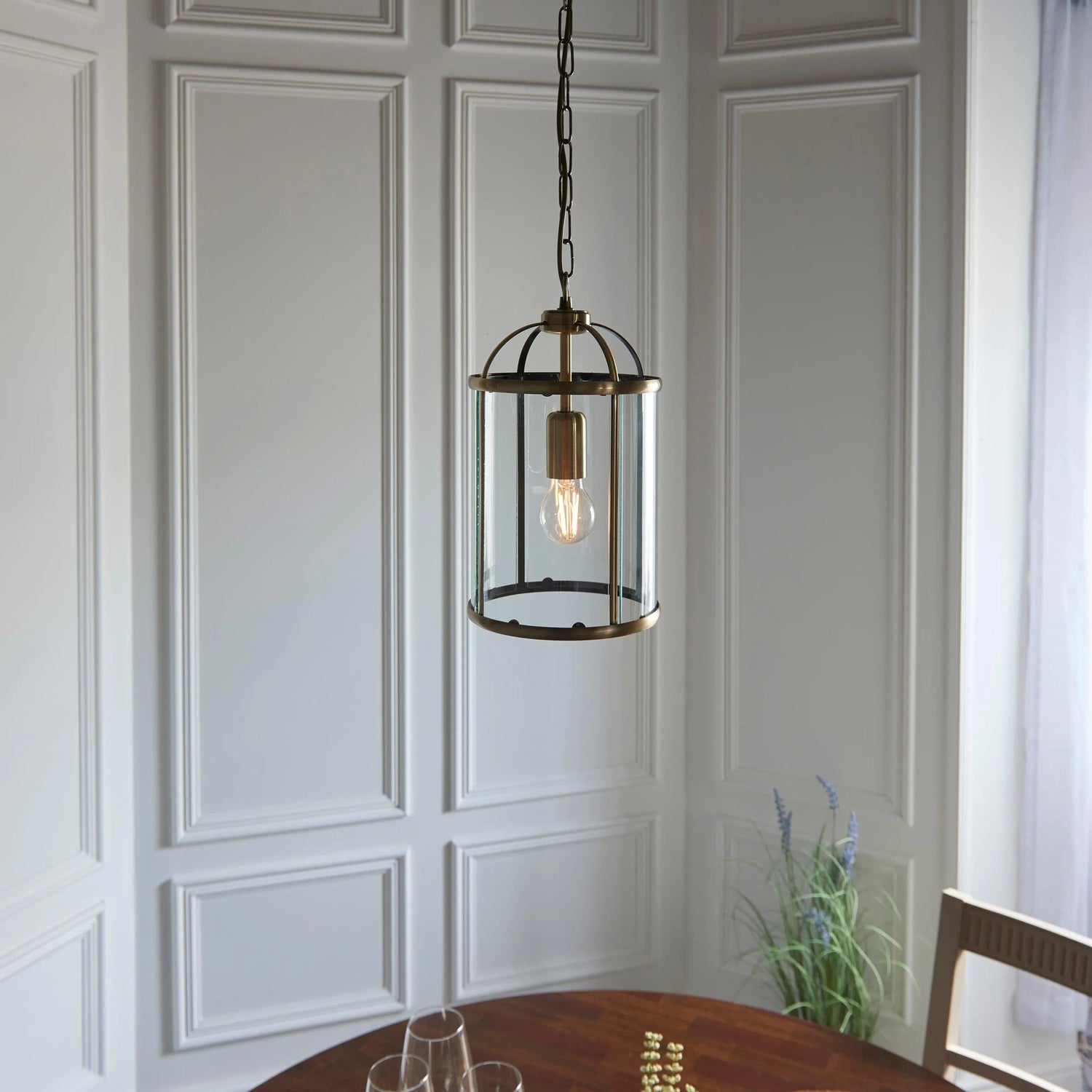 The Lambeth1 light pendant has an adjustable drop and combines a metal frame work with an antique brass finish and clear glass panels. Suitable for use with LED lamps and dimmable. Other size and finish options also available