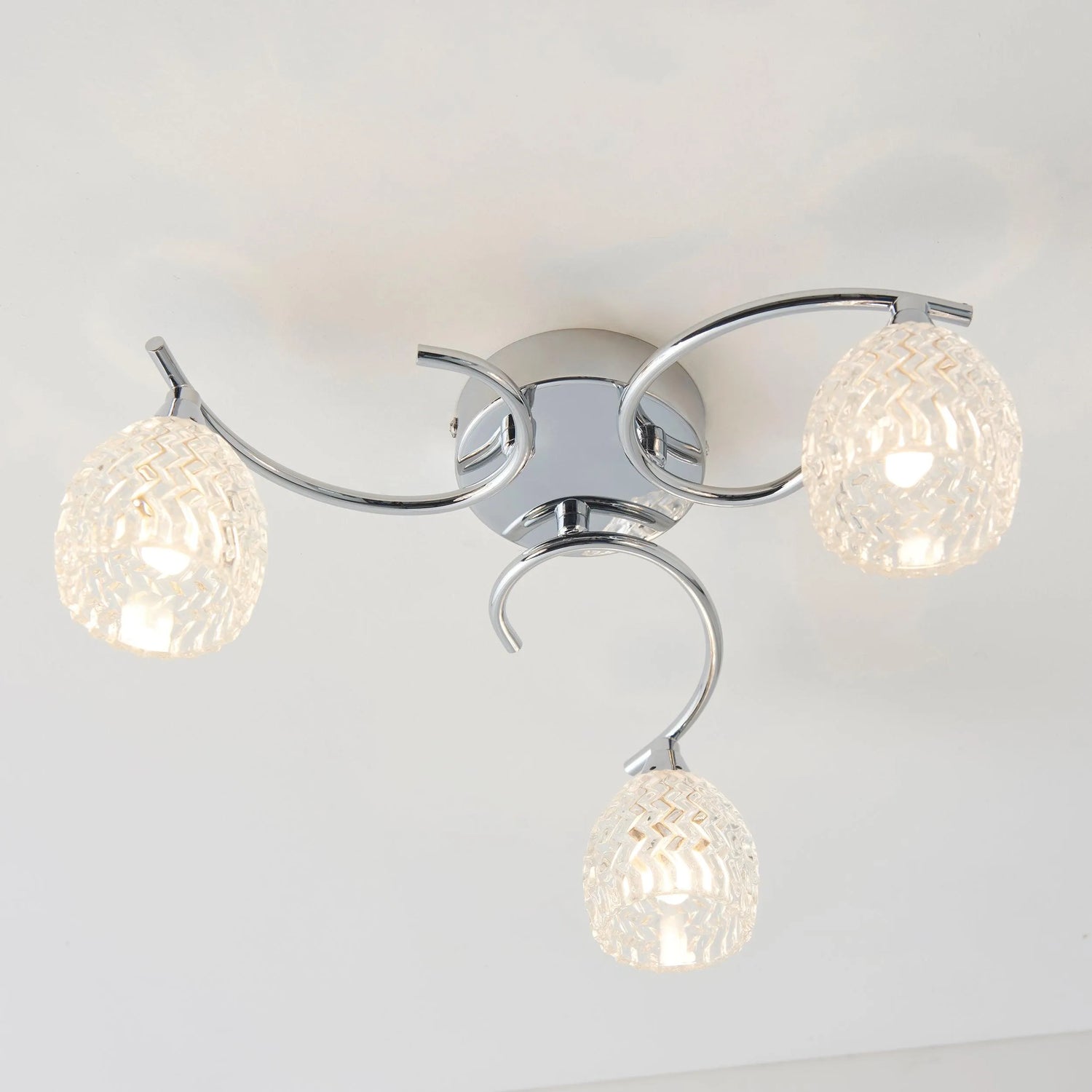 A 3 light flush ceiling fitting with curved metal arms in a chrome finish, and cut glass shades. suitable for use with LED lamps and dimmable. Matching items and other colour options available