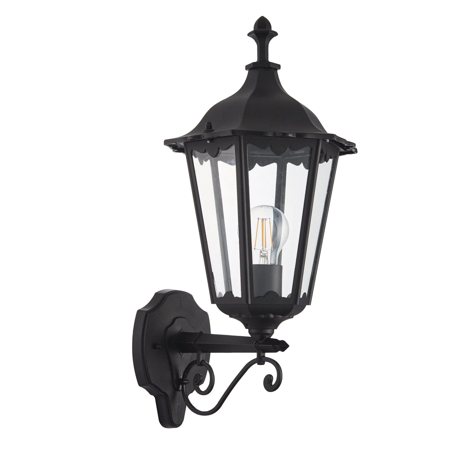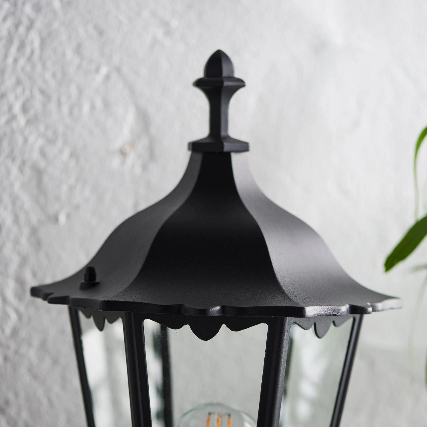 A timeless traditional exterior wall lantern, matt black painted die cast aluminium with clear glass panels and decorative scrollwork. Combine with a filament LED lamp to create an authentic look of the past.