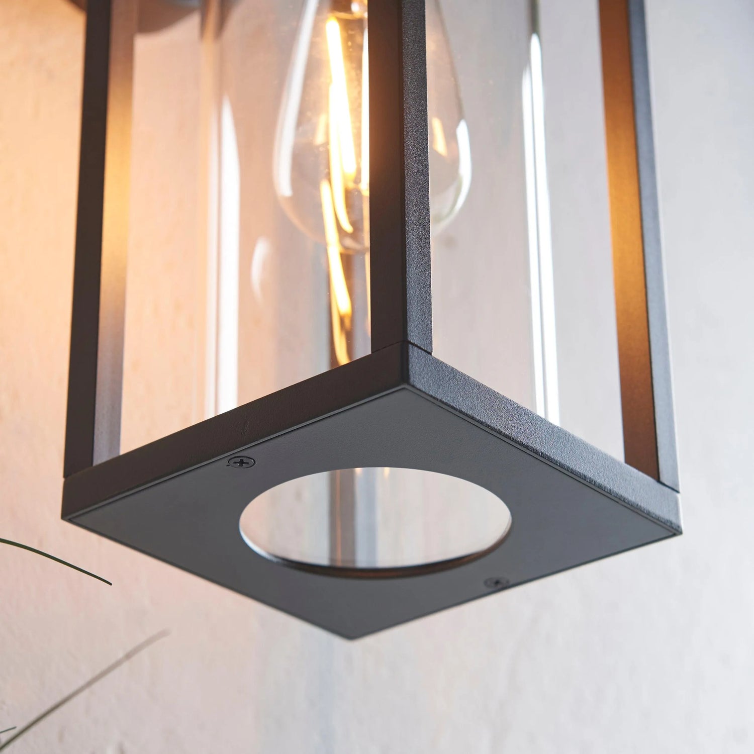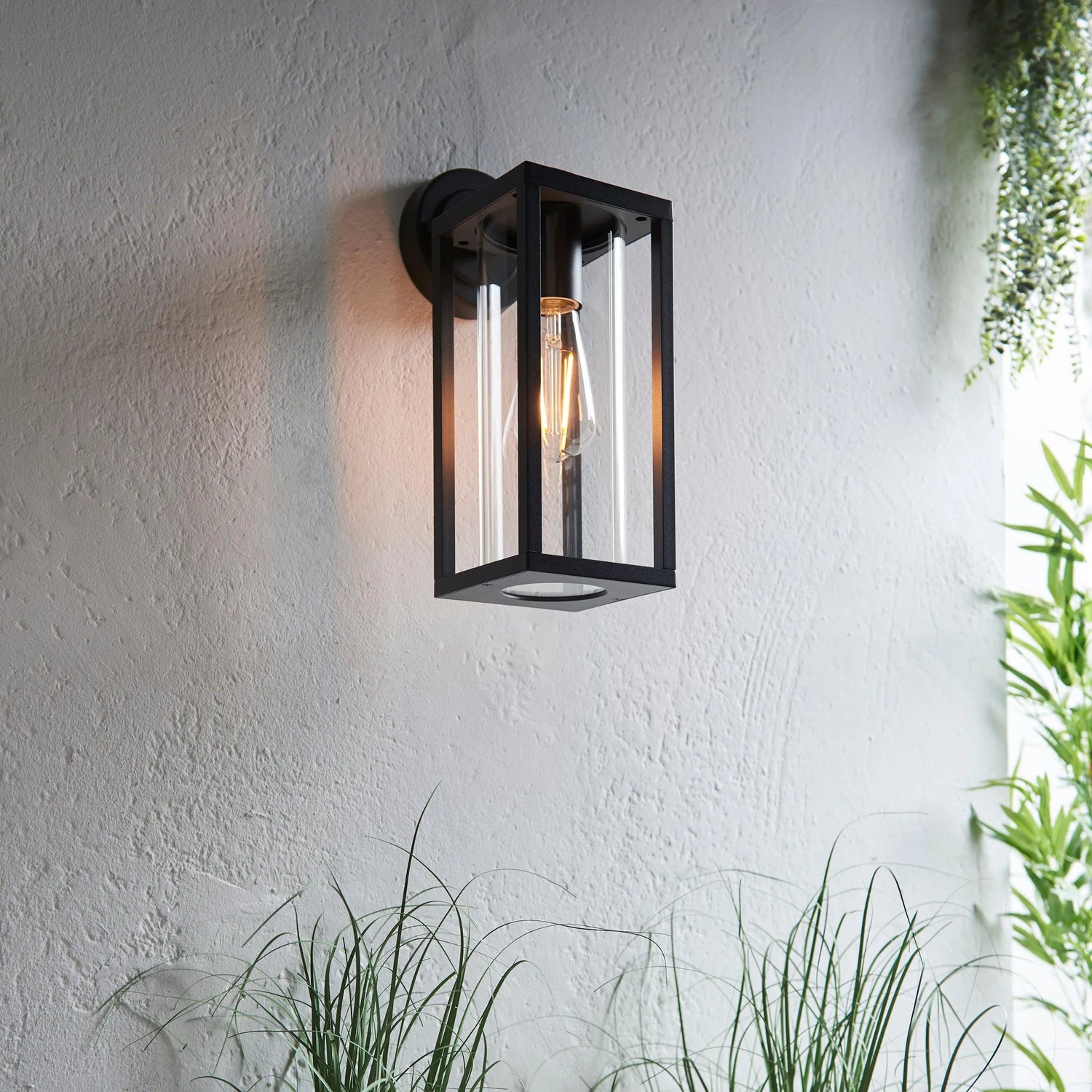Modern traditional exterior wall light in textured black finished metal work and clear glass diffuser. Corrosive resistant aluminium construction and IP44 rated for safe exterior use. Perfect for use with E27 LED filament lamps - this product is dimmable.