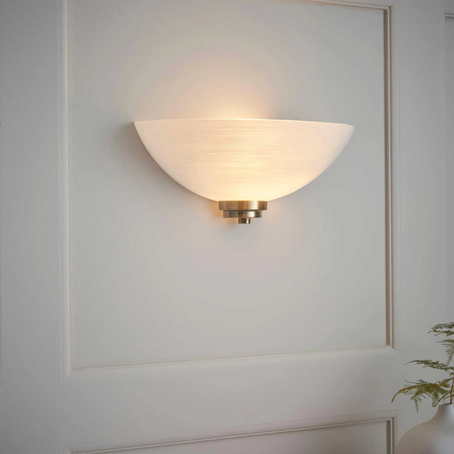 The Welles wall light has an antique brass finish complete with a white painted glass shade which has a faint line pattern. Other finishes and matching items are also available, all of which are suitable for use with LED lamps and are dimmable
