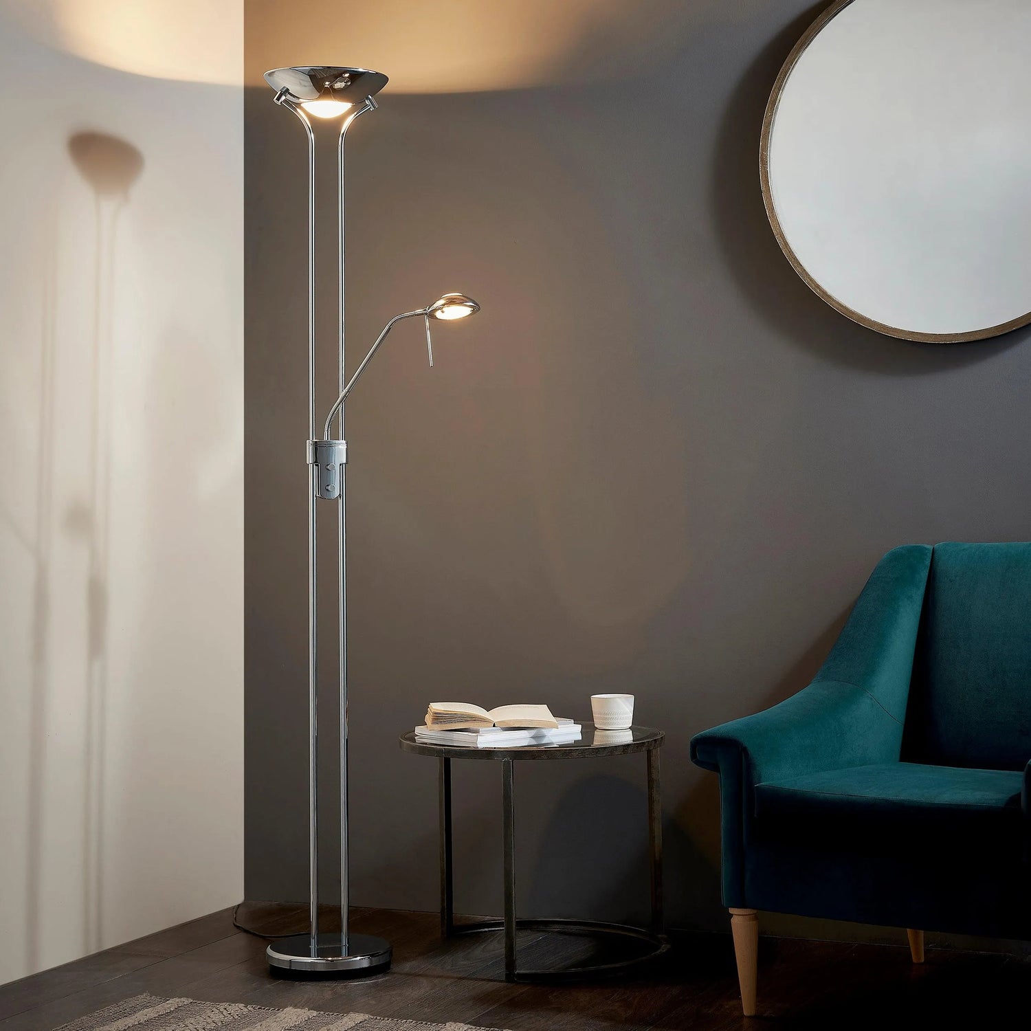 A tall 2 light floor lamp with a double stand supporting an uplighter as well as an adjustable branch holding a reading lamp. Chrome plated metalwork with a opal glass diffuser, complete with an easy to reach double rotary dimmer switch. Other colour options available