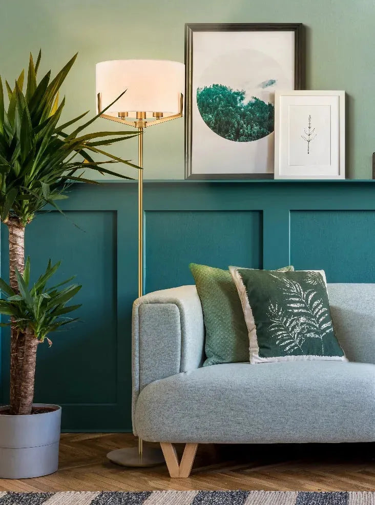 Cream textured fabric shade nestled within an aged brass finish floor lamp.