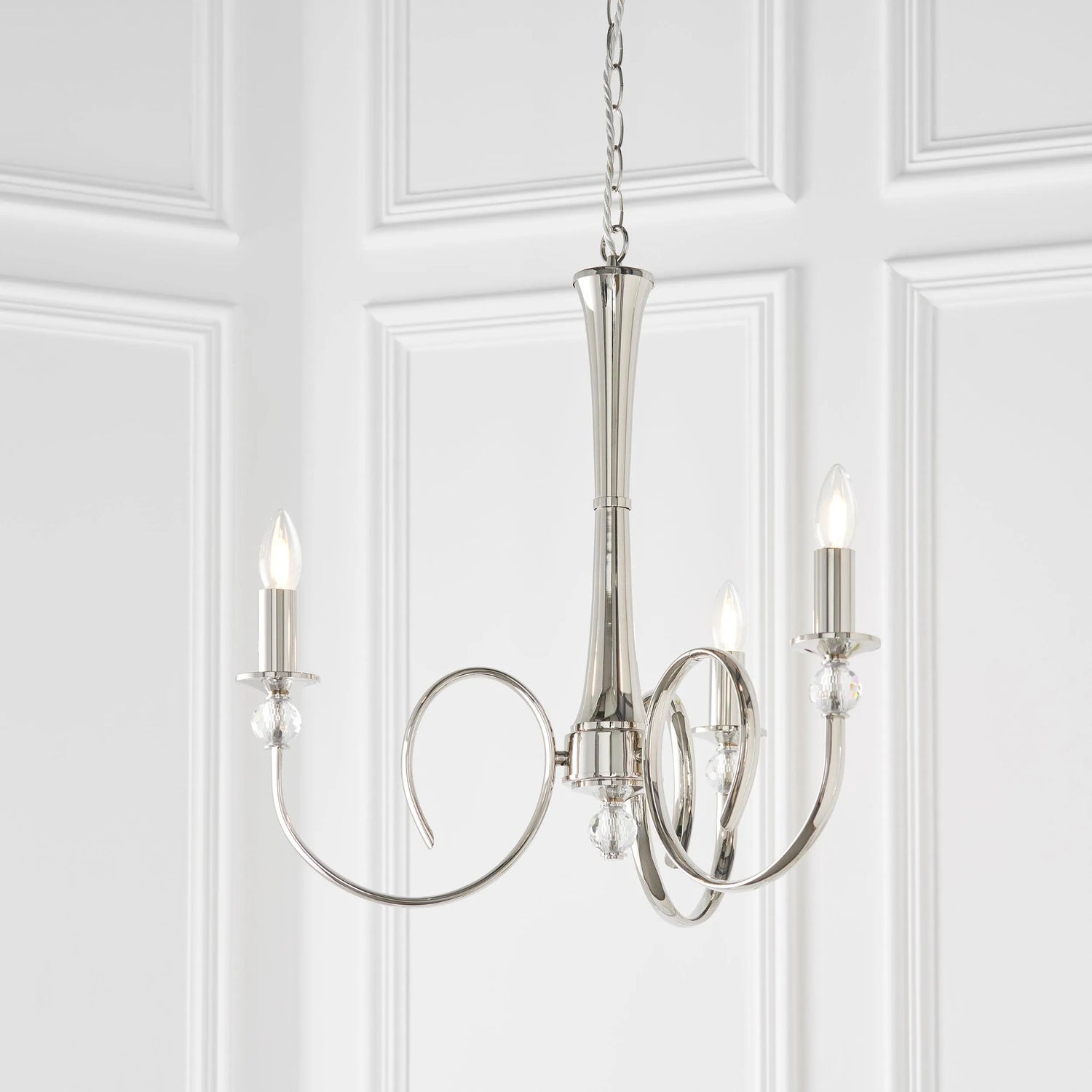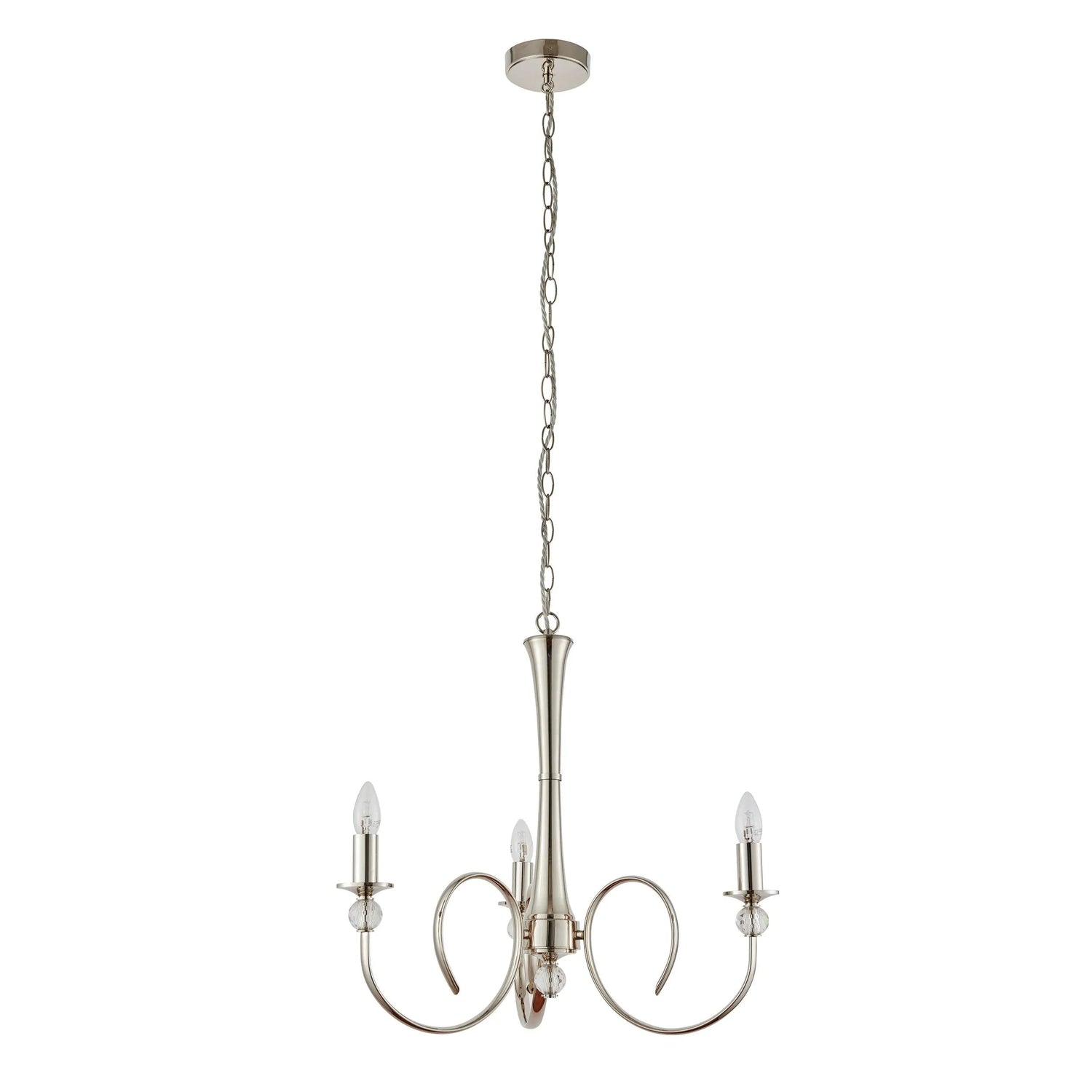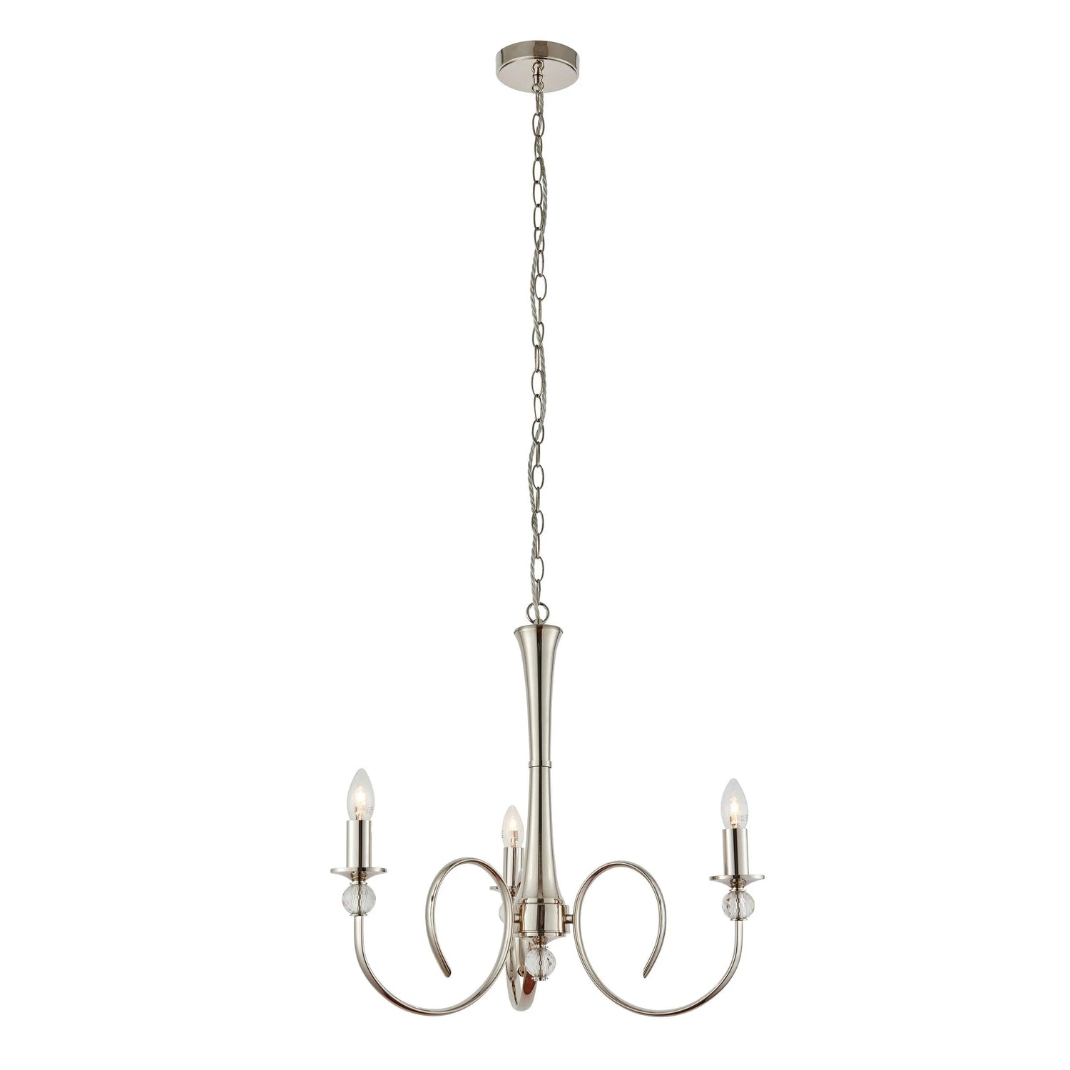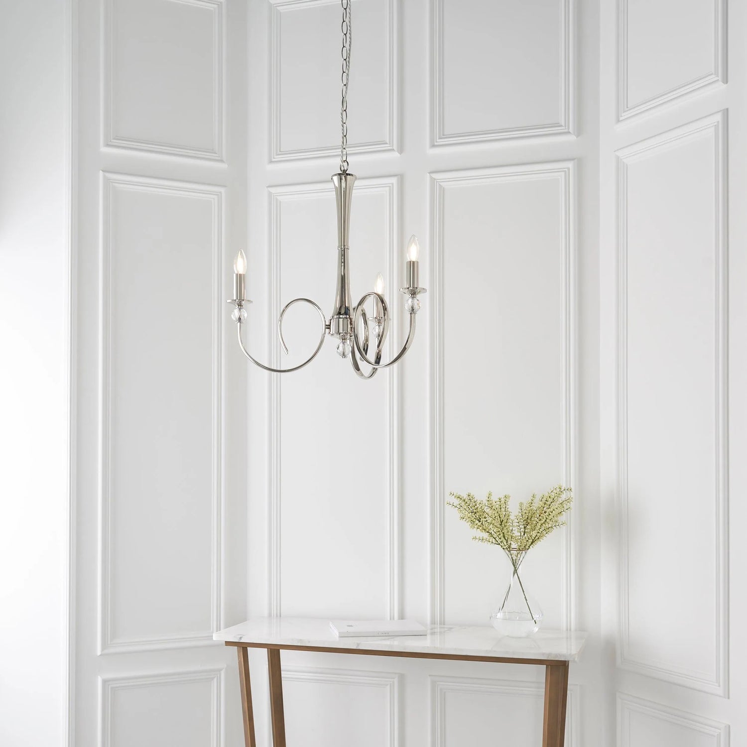 A stunning 3 light pendant incorporating beautifully curved arms adorned with crystal glass detailing and finished in a polished nickel plate. Compatible with LED lamps and dimmable.