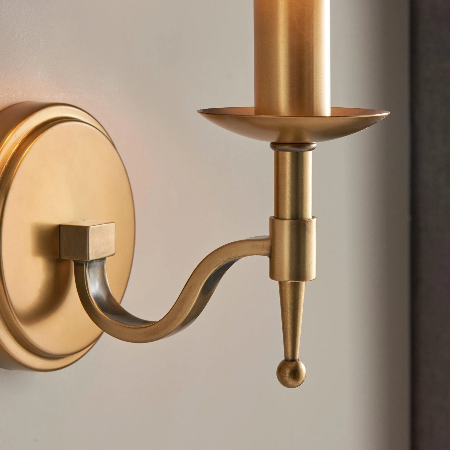 This elegant wall light from the Stanford antique brass range has a beautifully curved arm and simple clean detailing. Its complemented by a pretty, beige organza effect shade. Matching items available