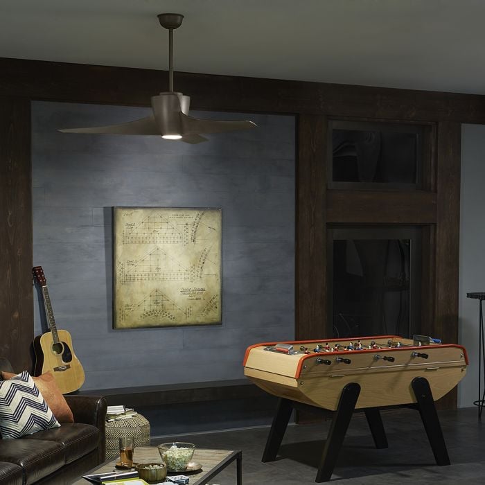 Sleek, stylish and solid with a triangular body and precision blades molded into one piece, creating a seamless contemporary design. The dimmable centre light provides a focal point as well as adding whole-room ambient light.