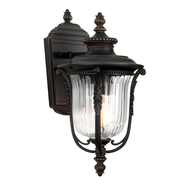 The Luverne collection features an Oil Rubbed Bronze finish that embellishes the nuanced bead patterns, medallions and scrollwork of these attractive outdoor lights. The tight pattern on the clear ribbed glass offers just the right light. IP44 rated.