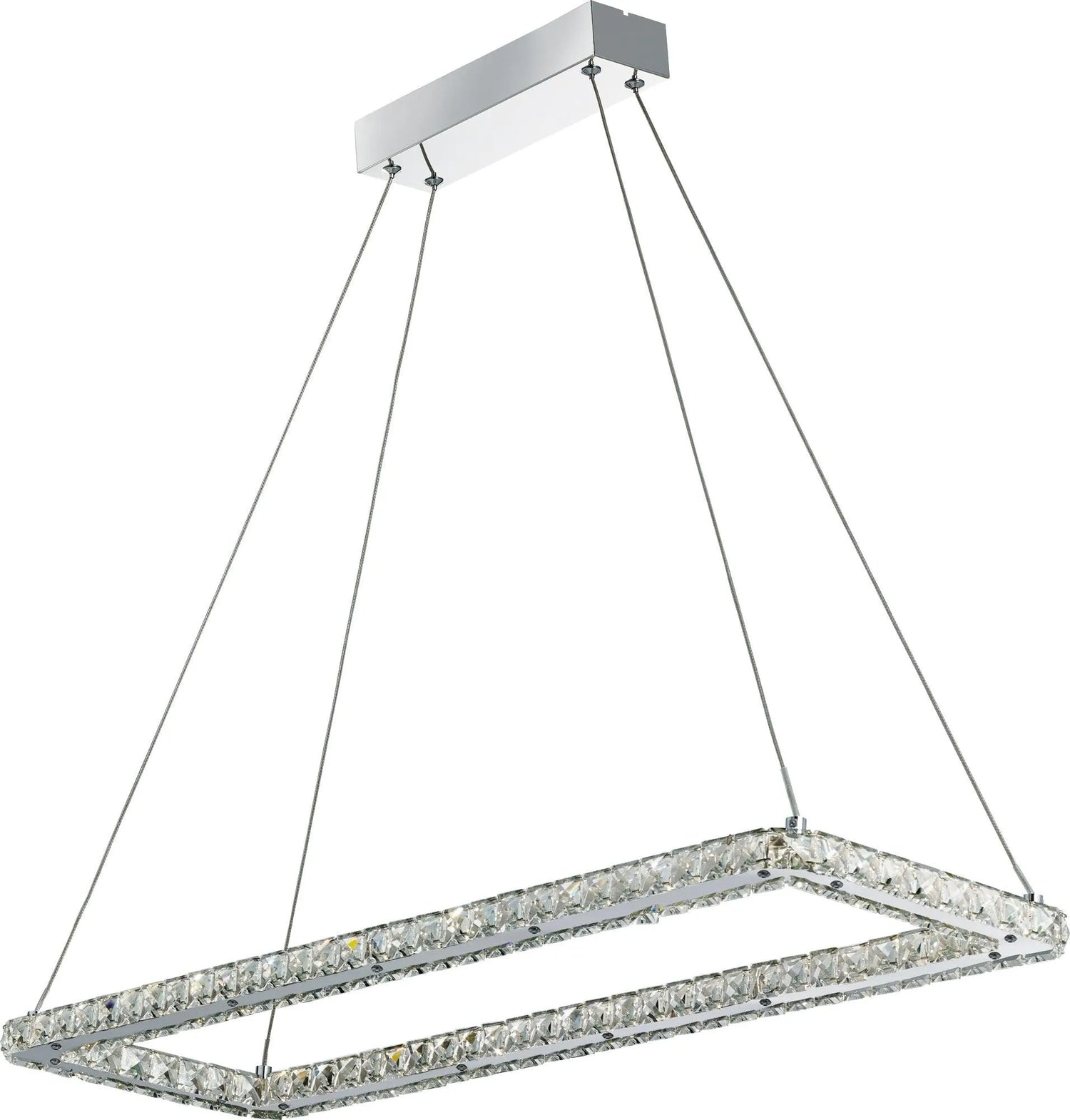 Crafted using chrome and clear glass pieces, this stunning ceiling pendant will add instant glamour to any room. The eye-catching rectangular shaped pendant suspends from a chrome rectangular ceiling plate, creating a stunning pendant, ideal for any living room, bedroom or hallway.