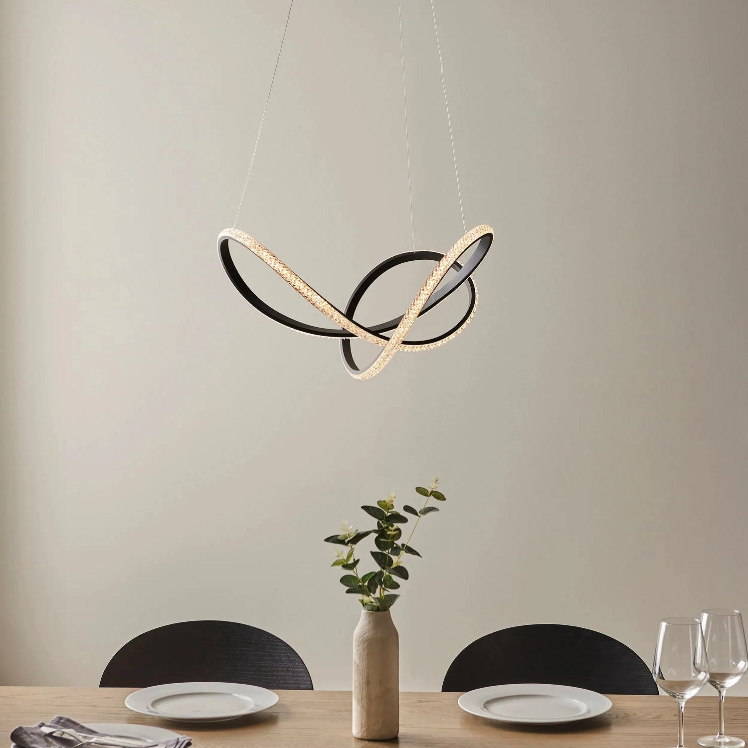 Contemporary elegance is optimised in matt black curves embellished with clear faceted detail - hang this LED pendant above a dining table, or living room to create a sophisticated focal piece.