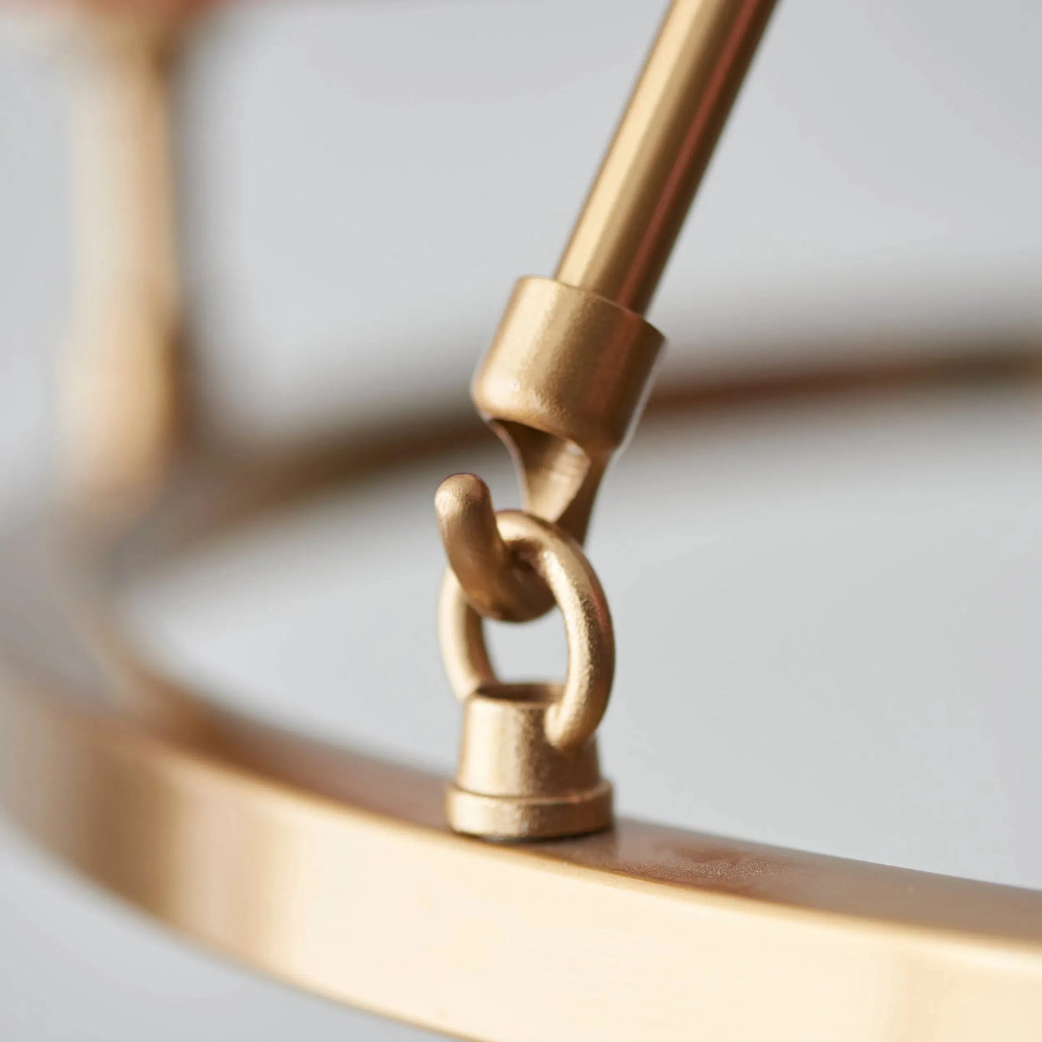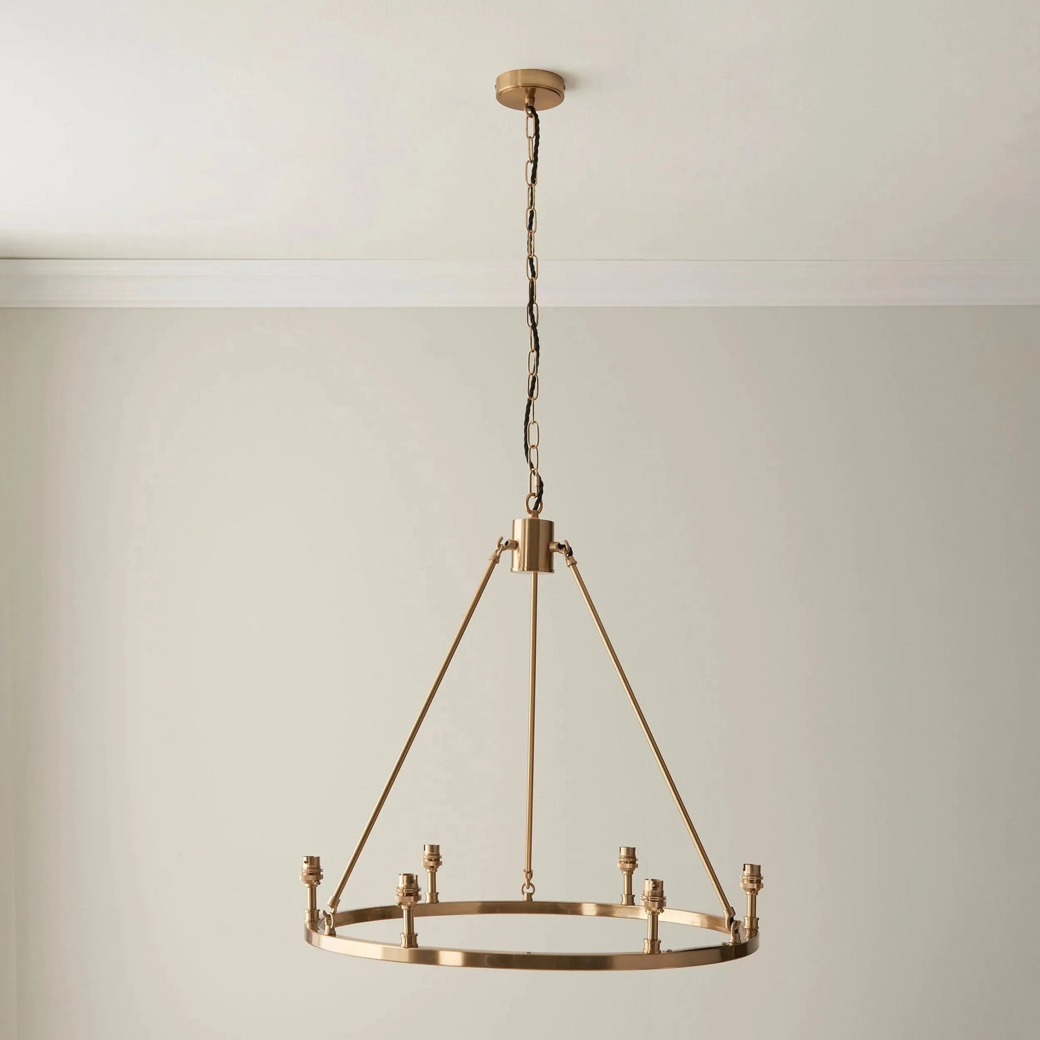 The timeless simplicity of a hoop design finished in aged brass plate with authentic brass B22 lamp holders makes the Chester the perfect addition to your home. With height adjustable chain and twisted fabric flex. This is a fitting only pendant, complete the look with 6 of our 16cm decorative fabric shades for a timeless chandelier to be proud of.