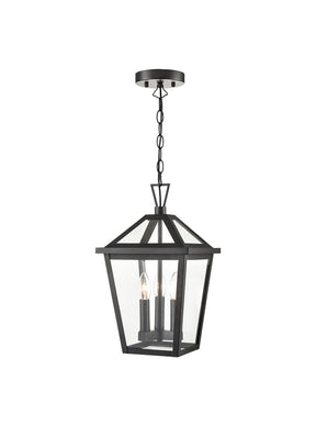 Matt black finish 3 light exterior pendant with fully enclosed clear glass panels. Rated IP44.