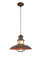 A pendant in painted distressed bronze on a brown twisted braided cable with frosted glass and cage detail.