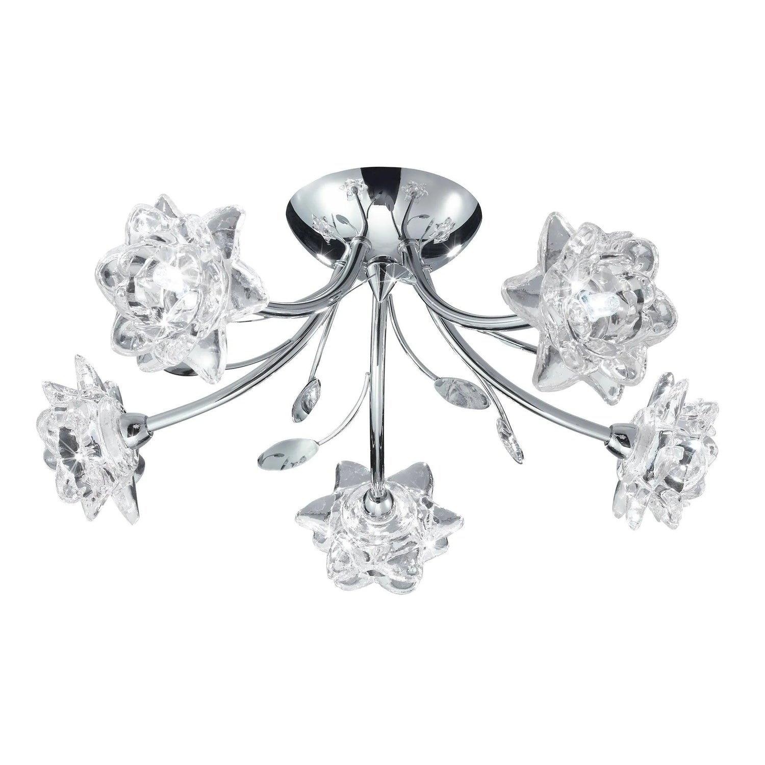 The Bellis chrome 5 light fitting with clear flower glass and leaf decoration looks stunning on the ceiling of any modern bedroom, living room, dining room or kitchen. The intricate glass and chrome finish fitting fits flush to the ceiling and has five ornate flowers that illuminate the room beautifully.