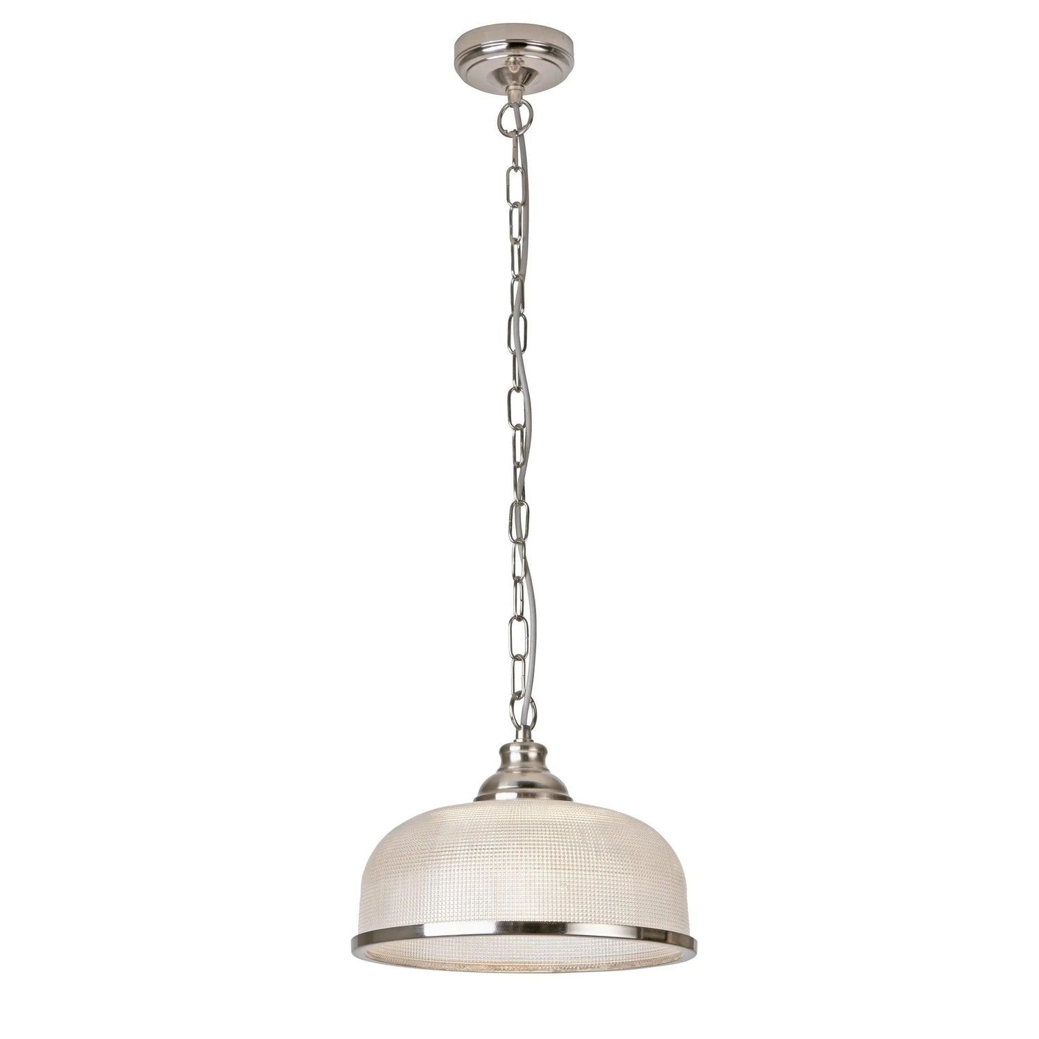 From the Bistro II collection, this pendant includes an attractive combination of satin silver and holophane style glass. A sturdy chain sits on top of the textured ribbed effect glass shade which is complete with a satin silver trim. Light shines through the holophane glass and emits a warm subdued glow.