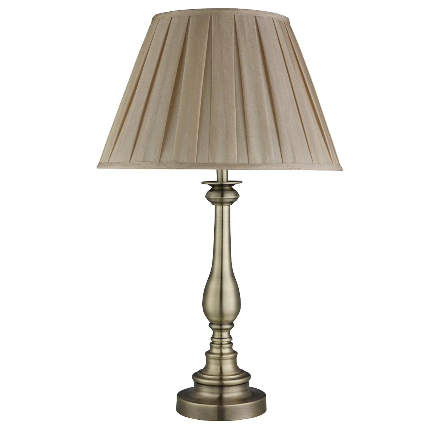 The Flemish table lamp is classic and ornate and an ideal accompaniment to any more traditional decor. The antique brass finish stand has a traditional shapely design and a spindle base, with a tasteful overlapping mink coloured fabric shade at the top. It looks elegant and sophisticated in any setting.