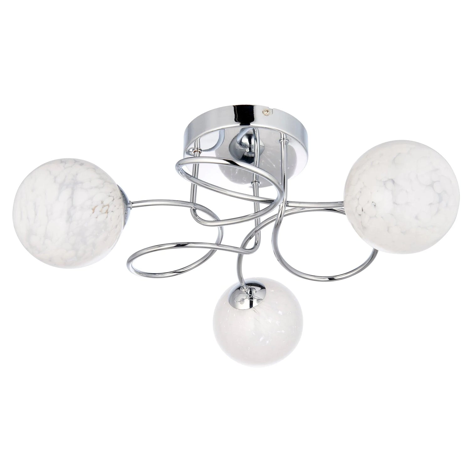 Modern design with a nod to the classic. Confetti glass is set amongst designer intertwined arms for chrome plate finish flush light; perfect for low ceilings.