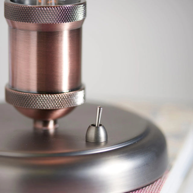 A simple table top industrial styled table light, finished in aged pewter and aged copper, making it bang up to date with on-trend 'resto' styling. Knurled lamp holders complete the authentic look. Perfect when paired with filament LED lamps and easily controlled by a simple on/off base switch.