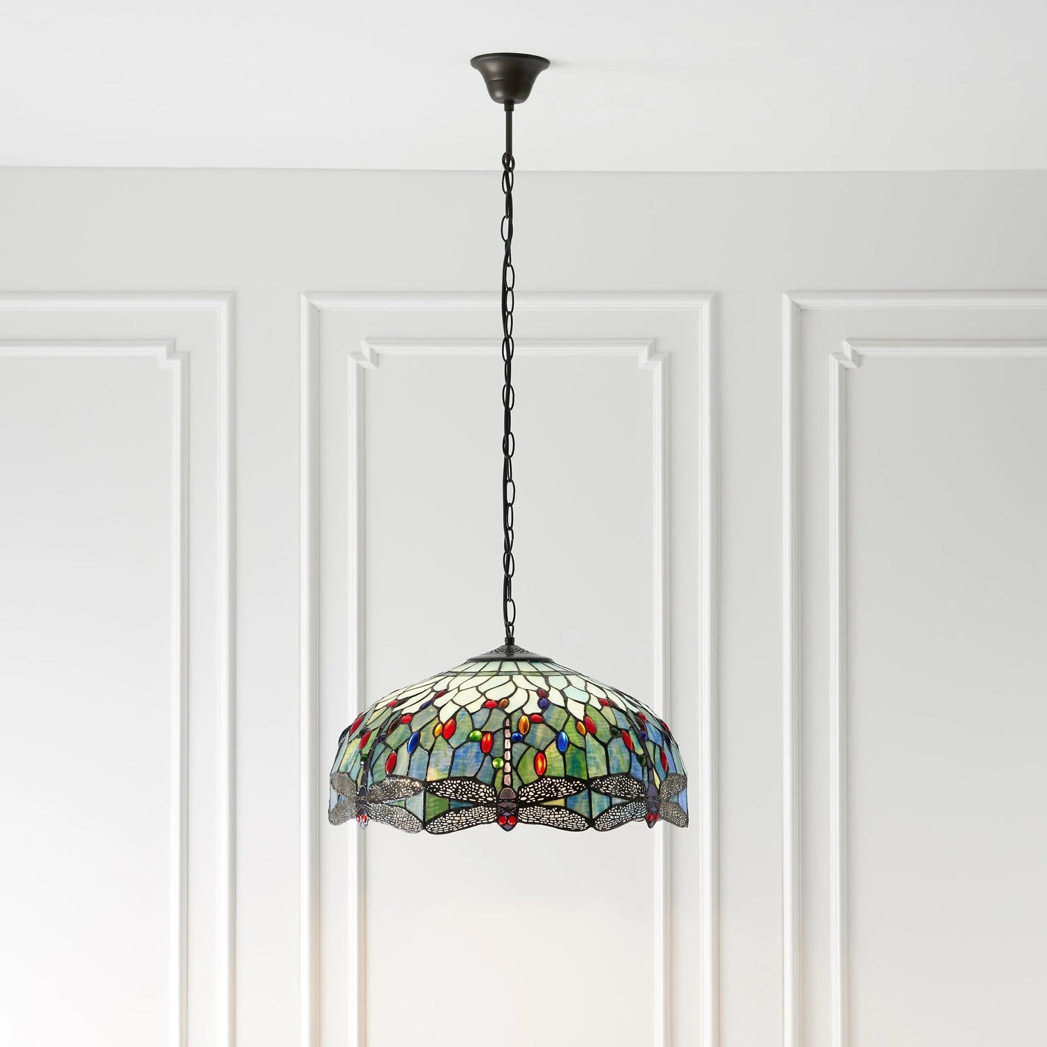 A stunning large 3 light pendant with the iconic Tiffany Dragonfly design in a vivid blues with multi coloured glass beading. Teamed with a dark bronze effect fitting. Dimmable and compatible with LED lamps