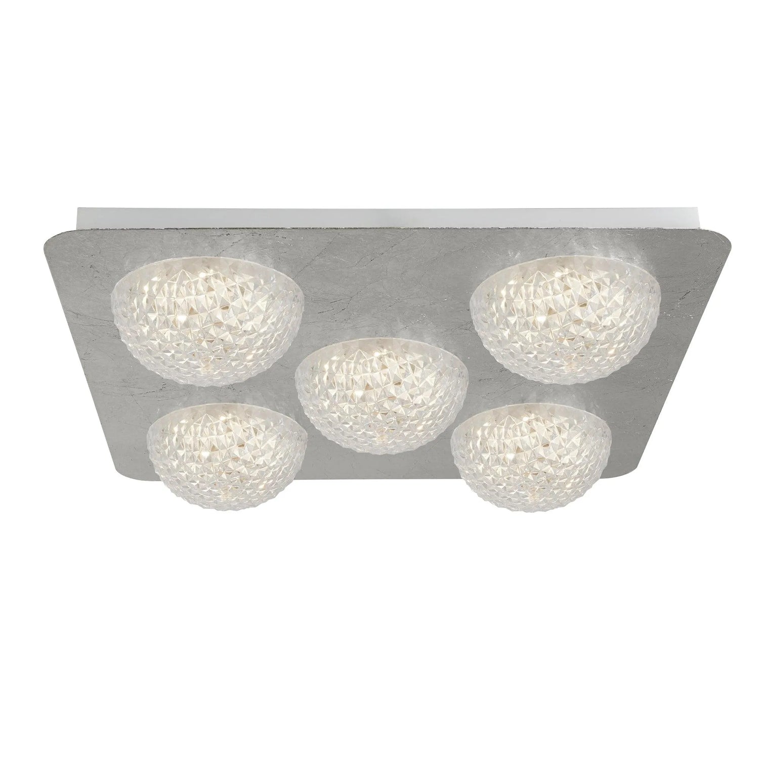 A unique and modern flush light, the Celestia features a metal base finished in stunning silver leaf and the 5 clear acrylic half spheres have a pretty, cut crystal design that casts the light out from the integrated LED in a warm white patterned glow. Ideal for halls, living rooms and porches with low ceilings, it can also be Controlled with a dimmer switch. LED's use up to 75% less energy and last up to 20 times longer than incandescent bulbs.