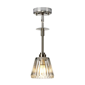 The Agatha range is IP44 rated for bathrooms but can still be used in corridors and other living spaces. An integral LED lights up the acrylic rod on the wall light and 3-light pendant. Light sparkles through clear cut glass shades on all models. The range come in two finishes, Polished Chrome and Brushed Nickel.