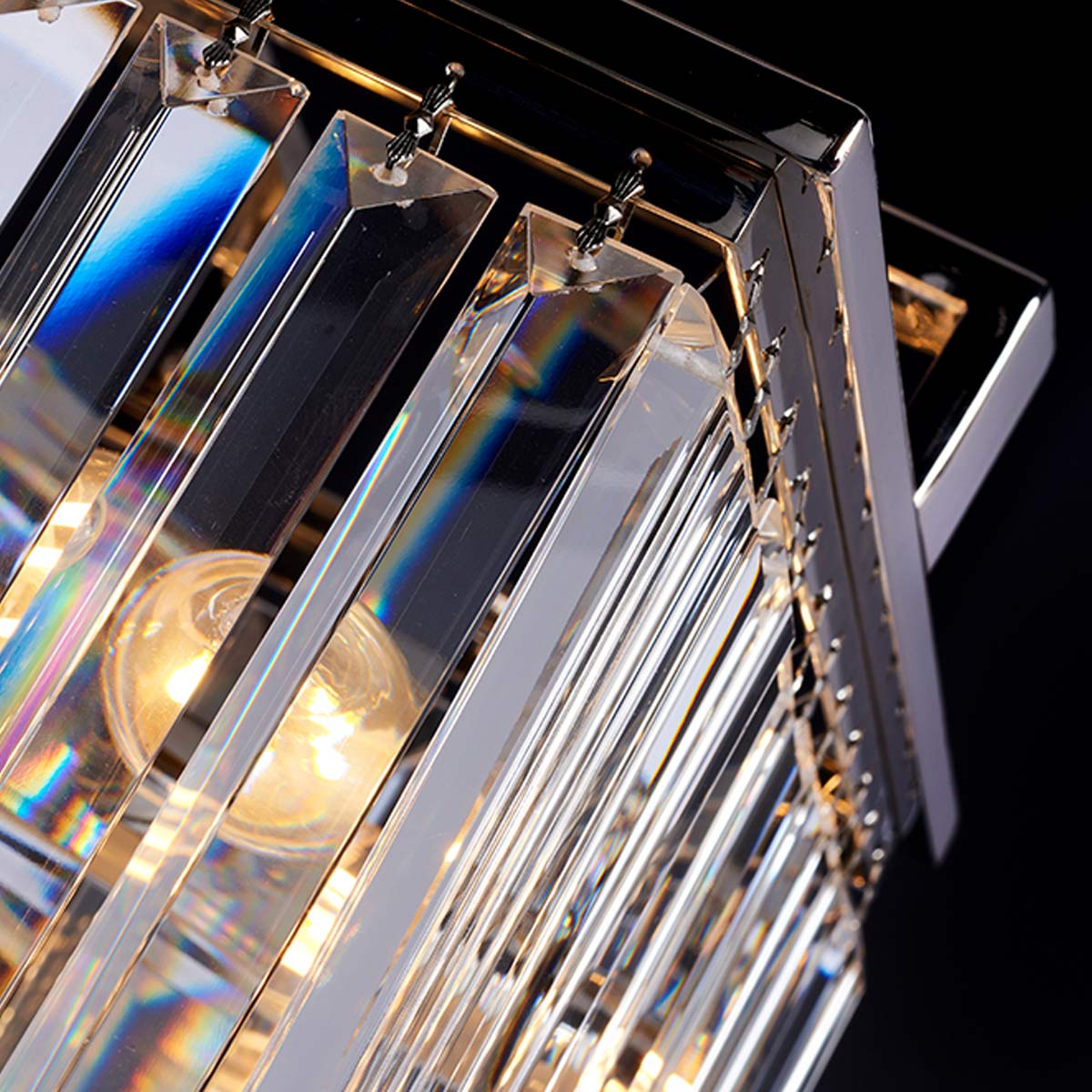 Aries has a bold square arm architecture, finished in Polished Nickel and is complemented with high quality cut glass crystals. A softer opal glass bottom panel contrasts with loosely hanging alternating side crystals that offer a playful lighting effect.