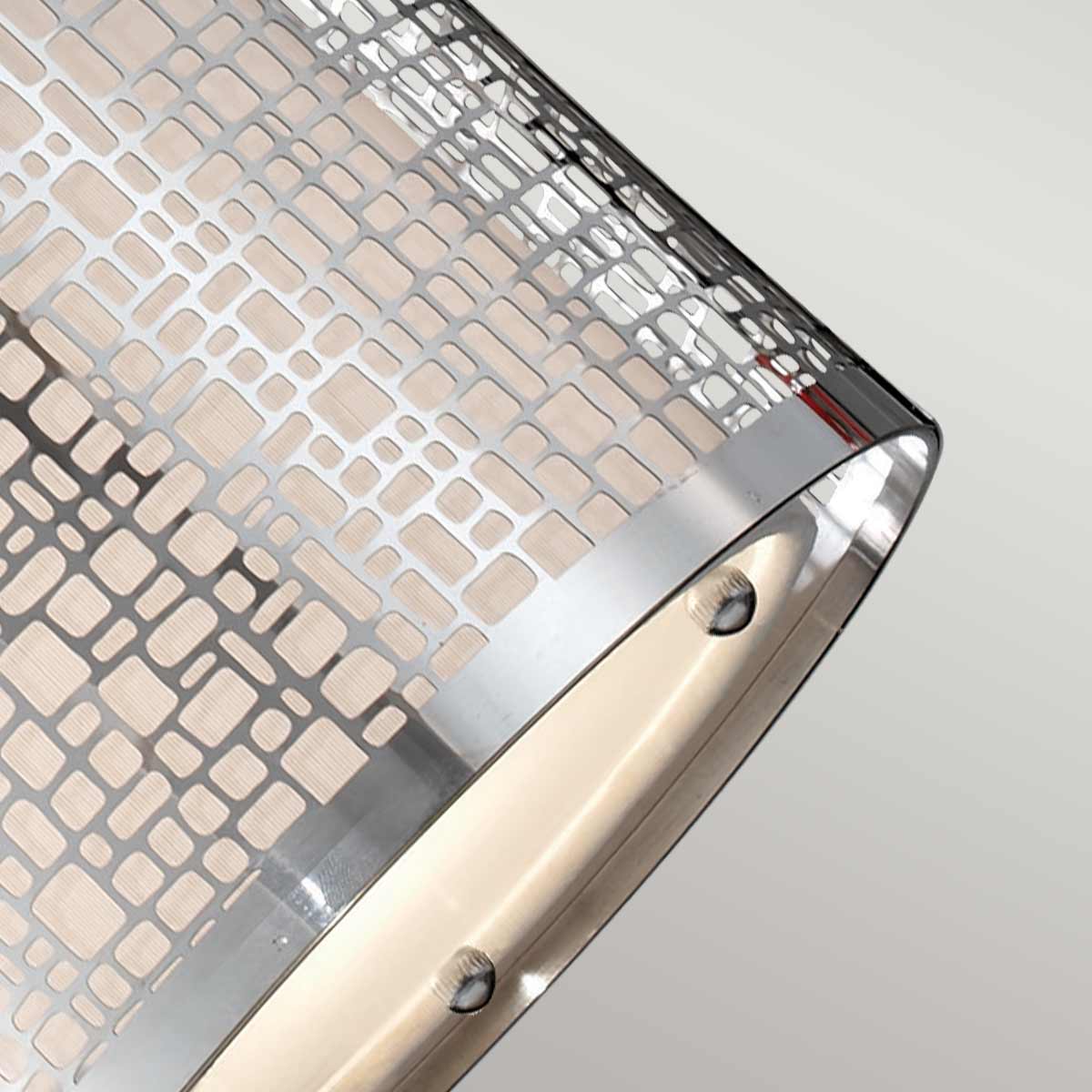The ubiquitous drum shade has been updated with a wholly contemporary look with the Chrome laser cut metal shade surrounding the off-white silk inner shade. The Joplin collection sends soft light through the random geometric patterns.