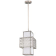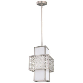 The contemporary Kenney collection is an updated take on a classic, mid-century modern design in a refined Sunrise Silver finish. A decorative, dual-layered, geometric motif is stamped out of the steel frame which floats over a white linen shade to create depth and visual interest.