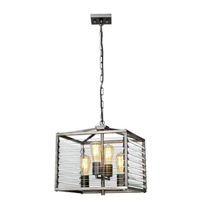 The Louvre range's attention grabbing form materialises from the Juxtaposition between the subtleness of its soft silver/brushed black finish and hard angular slats of clear glass. Filament style lamp bulbs finish the appearance, completing the gentle industrial aesthetic.