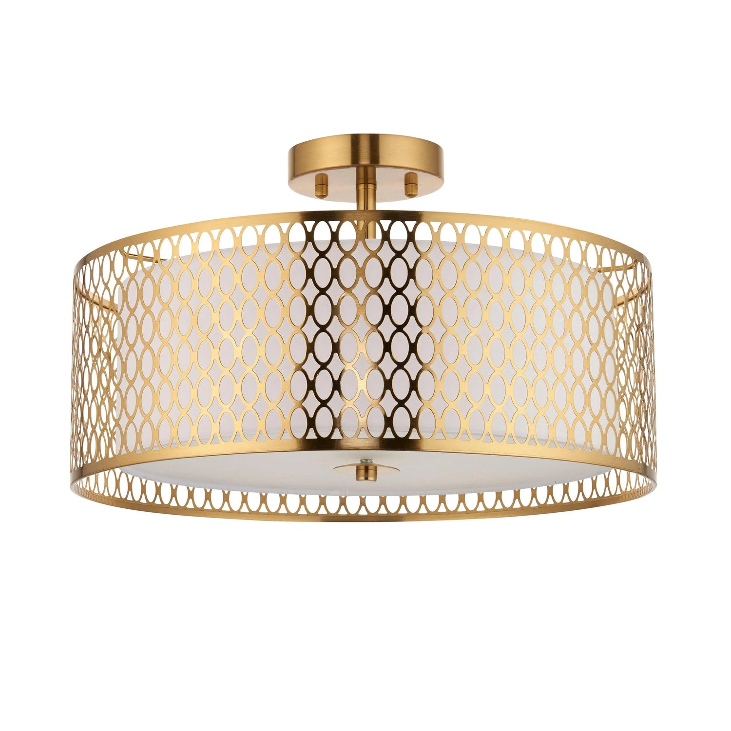 No compromise on design for low ceilings. This is a classic circular light with a trendy geometric fretwork metal outer and an inner fabric shade for lovely light diffusion. In a gold effect plate finish with frosted glass this light would compliment a range of interior style. This product is also dimmable to create a relaxing atmosphere.