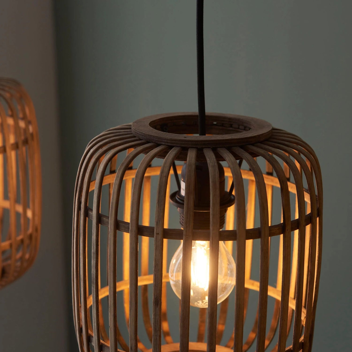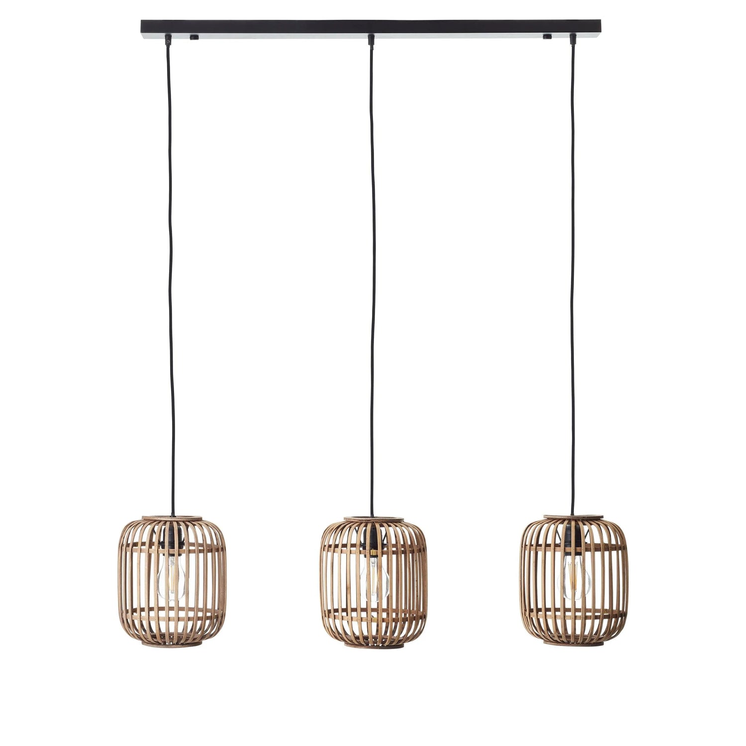 A simple and stylish three light pendant inspired by nature, sustainably sourced light bamboo cage, creating a soft warm light. Finished with matt black paint detailing.