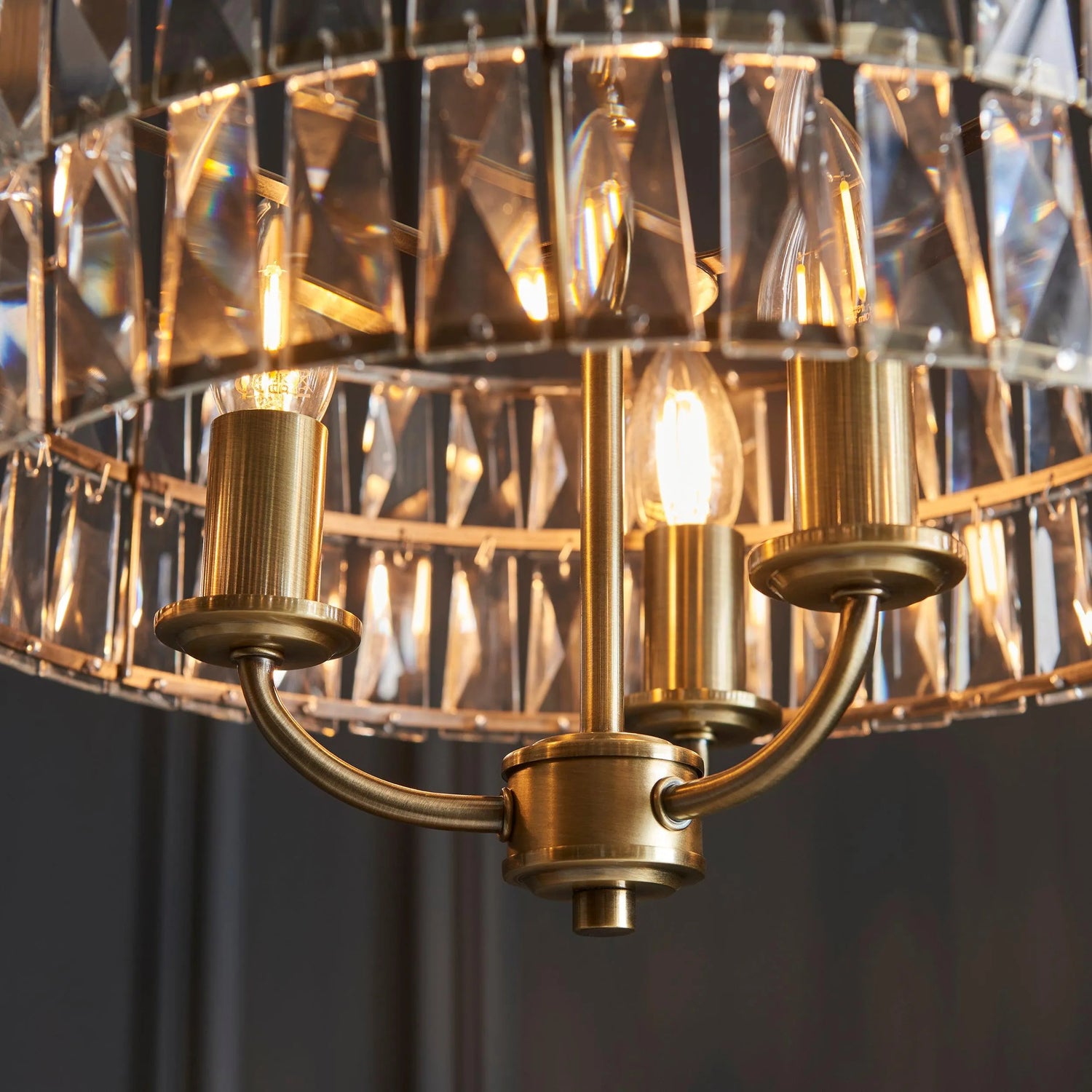 This 3 light pendant features stunning decorative clear cut faceted glass with gorgeous bright antique brass plated metal accents. Hung from a height adjustable chain this pendant creates an eye-catching pattern of light making it the perfect statement piece for any room.
