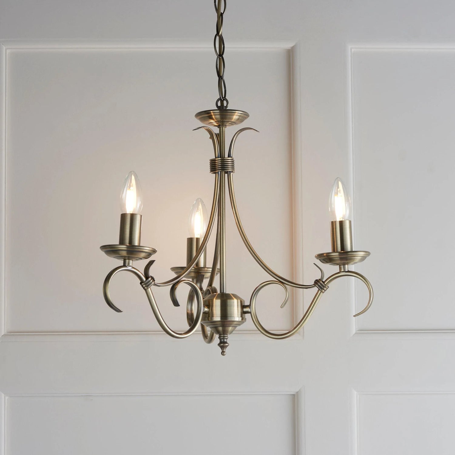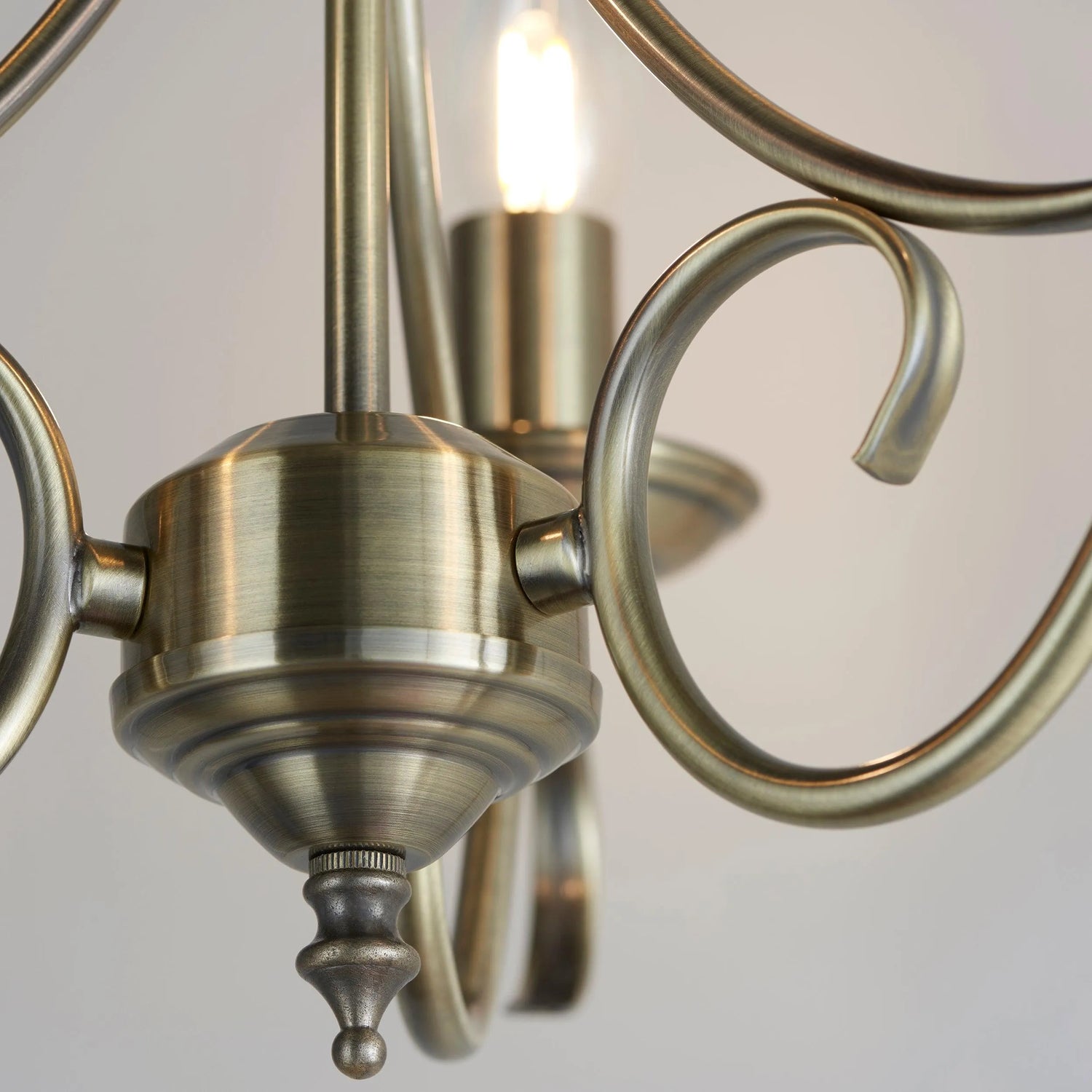 A 3 light ceiling fitting with scrolled arms in antique brass effect finish. suitable for use with LED lamps, height adjustable and dimmable. Matching items available and also comes in an antique silver finish